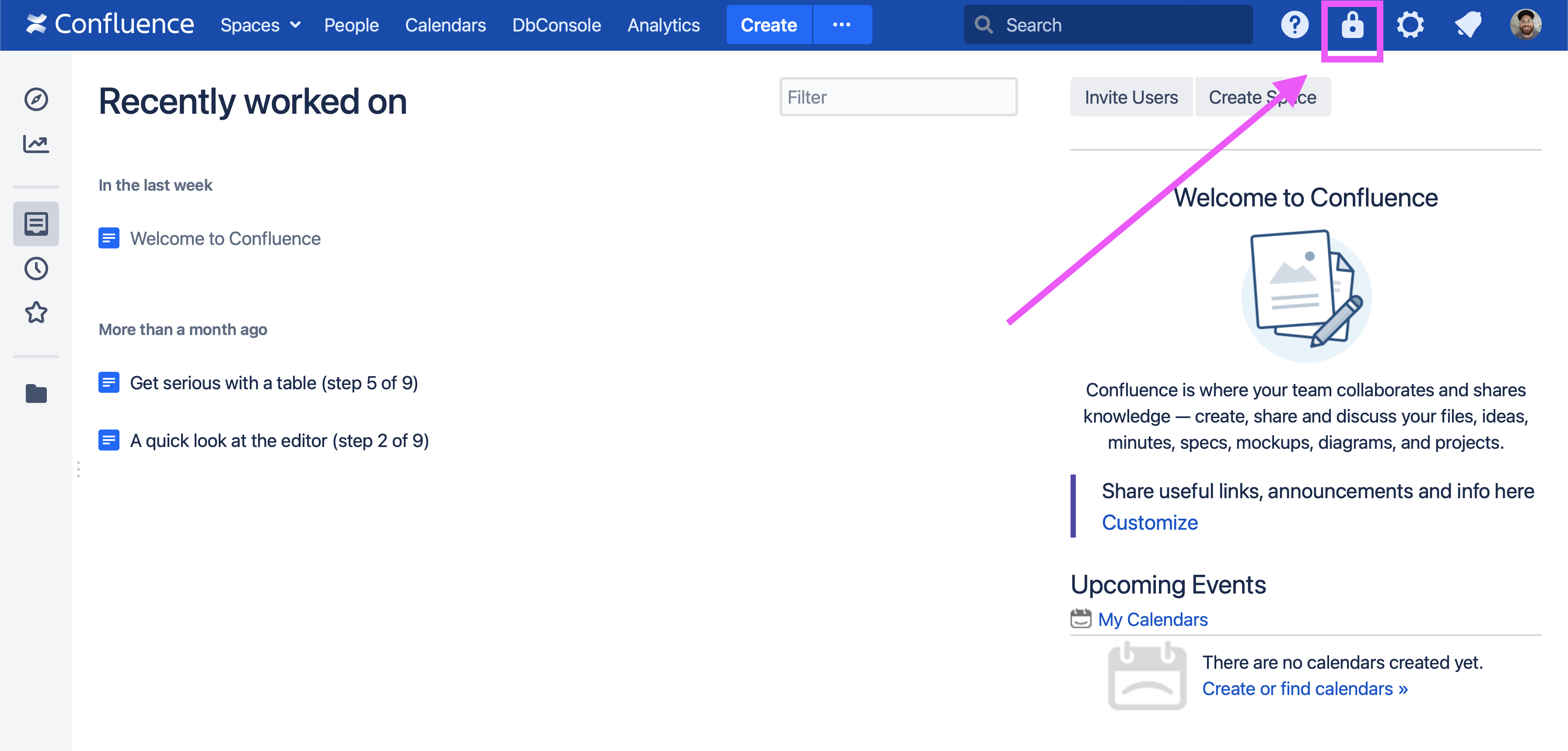 To reach the Soteri Dashboard, click the padlock icon in the top-right toolbar in Confluence: