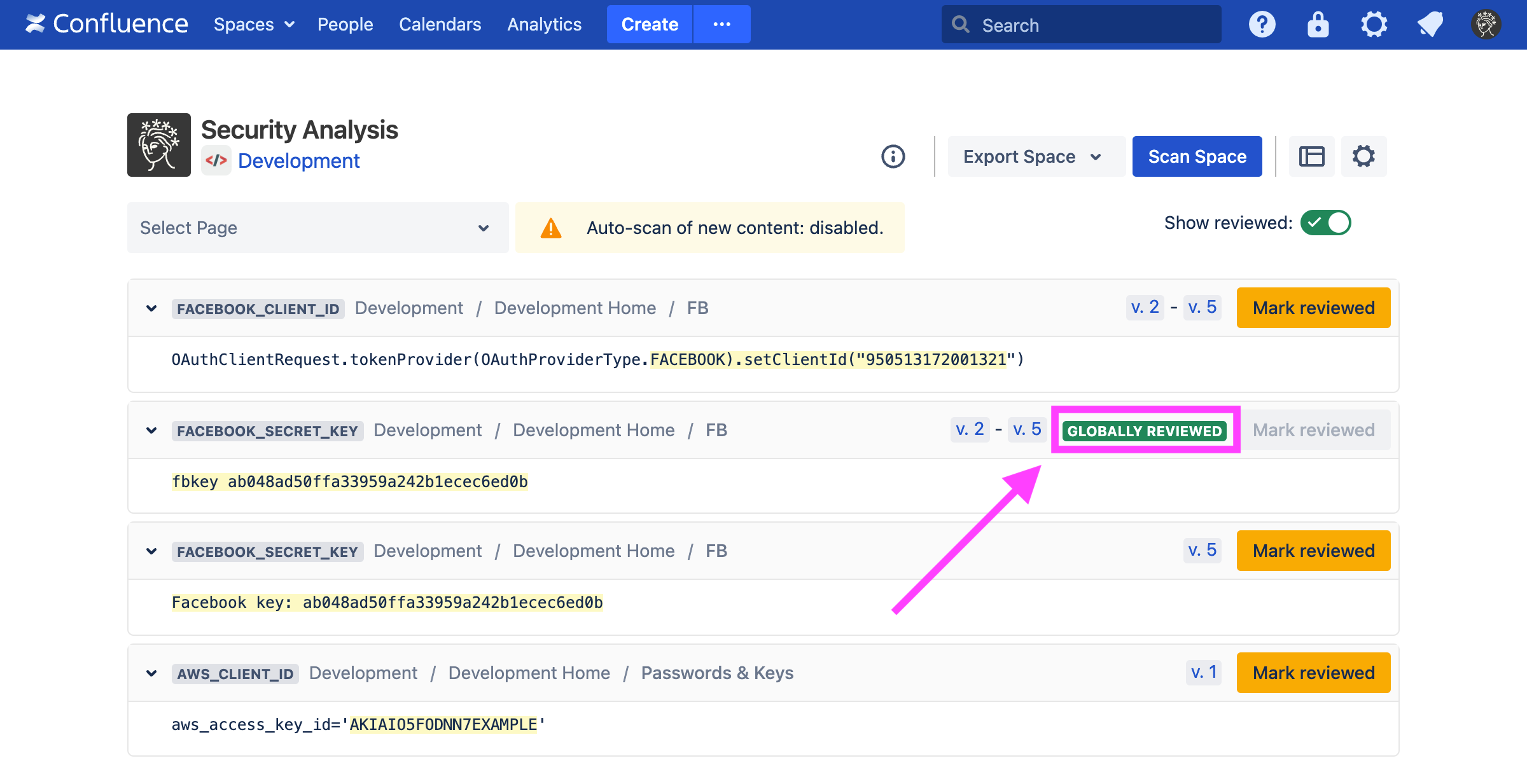 Note that reviewed false positives are scoped to a space; that is, identical findings across multiple spaces must be reviewed separately.