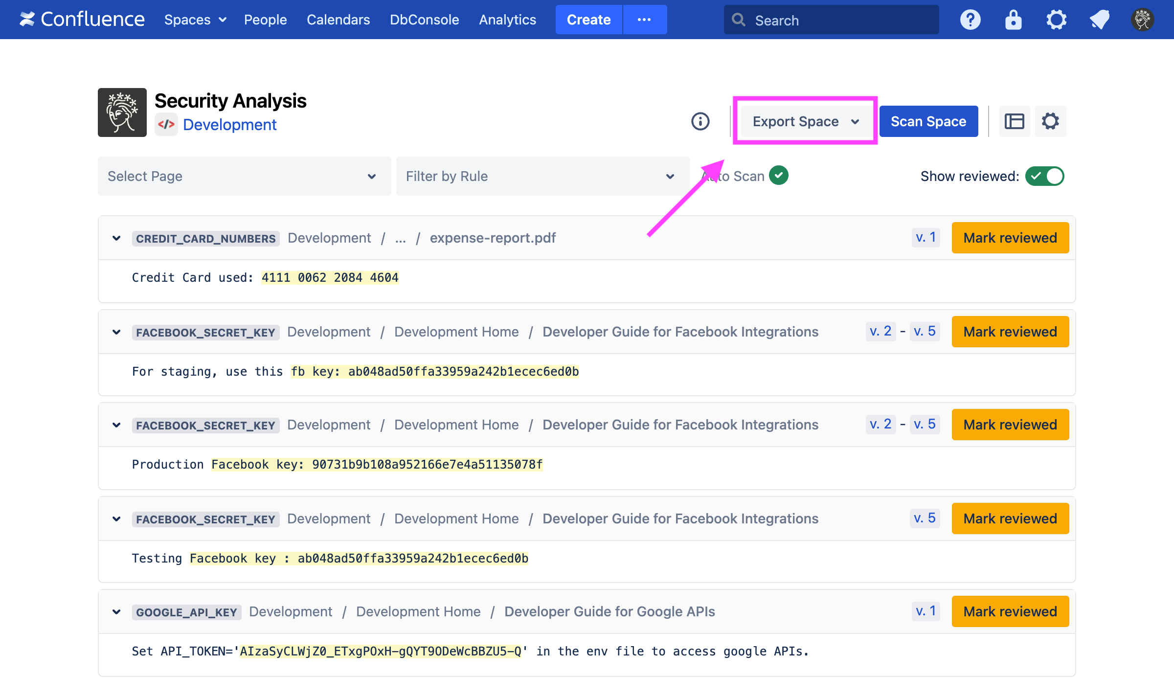 Sometimes, Security for Confluence will find false positives, credentials which have already been revoked, etc. If this happens, you can mark the finding as reviewed. This prevents the finding, as well as any other findings which exactly match it, as reviews the current and future scans.