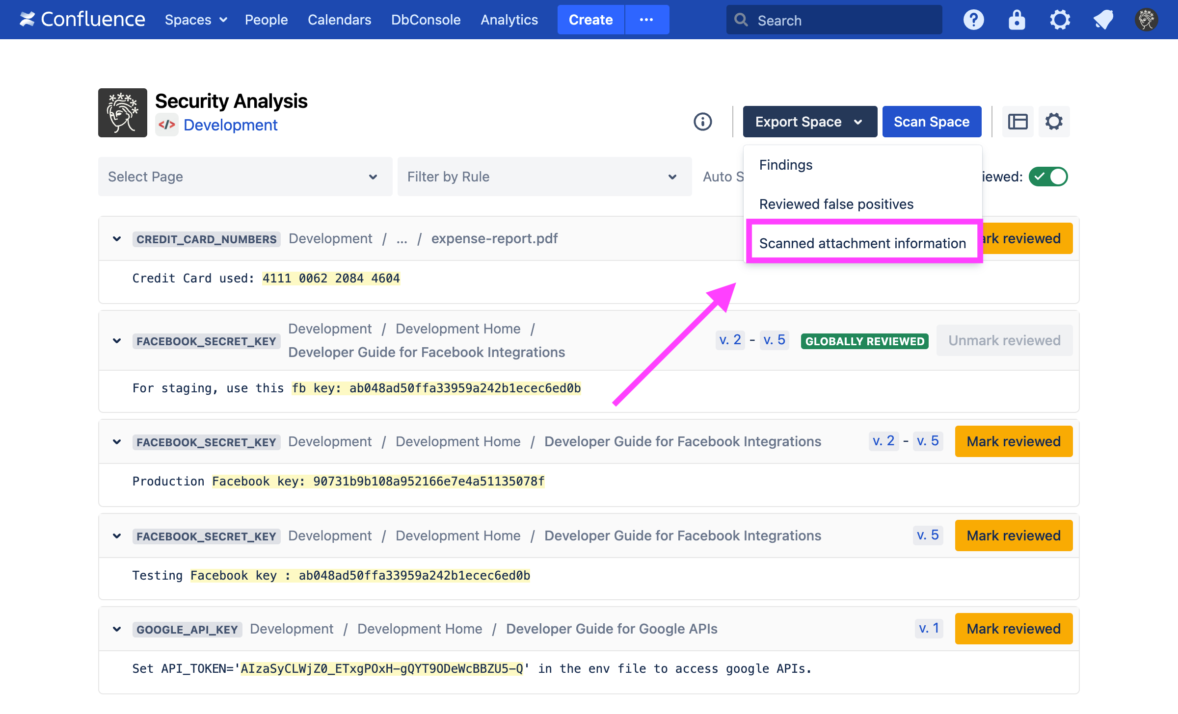 From the Security Analysis page, you can export attachment scan information for a specific space: