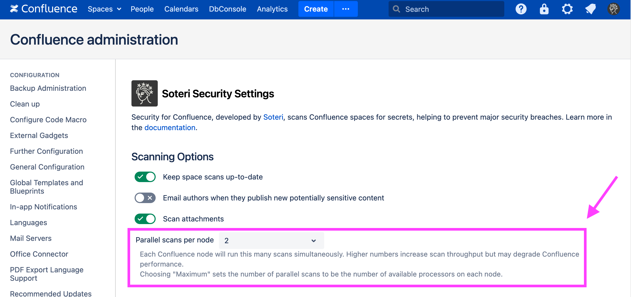 Security for Confluence distributes scanning to every Confluence Data Center node, and by default runs 2 scans in parallel per node. This number can be configured in the UI or via the REST API. Scans beyond the number of scans run in parallel are stored in a queue. This queue is accessible to all Confluence nodes.