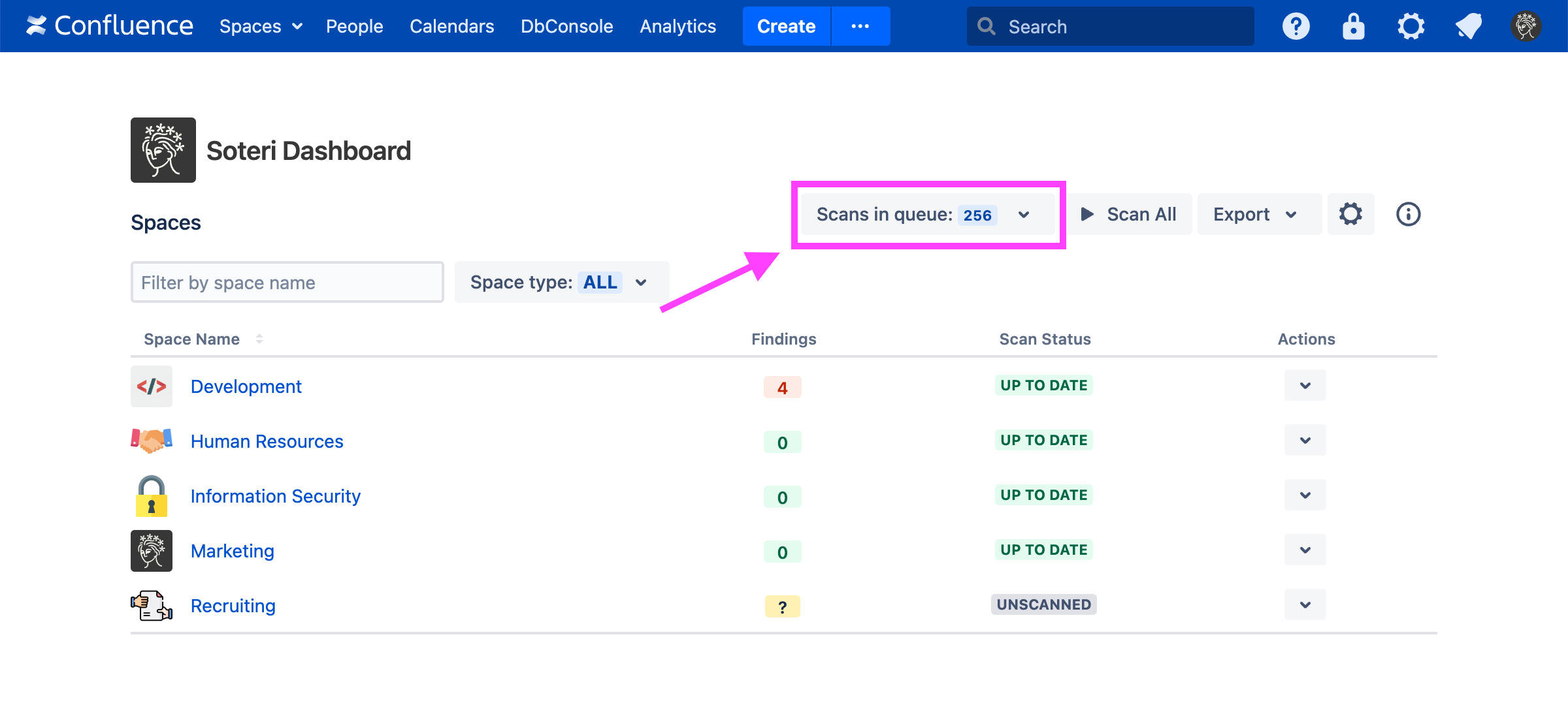 Choosing “Scan” will trigger a scan for new and modified pages in that space. Choosing “Export” will download a list of all findings for that space in CSV format. Read more about exports here.