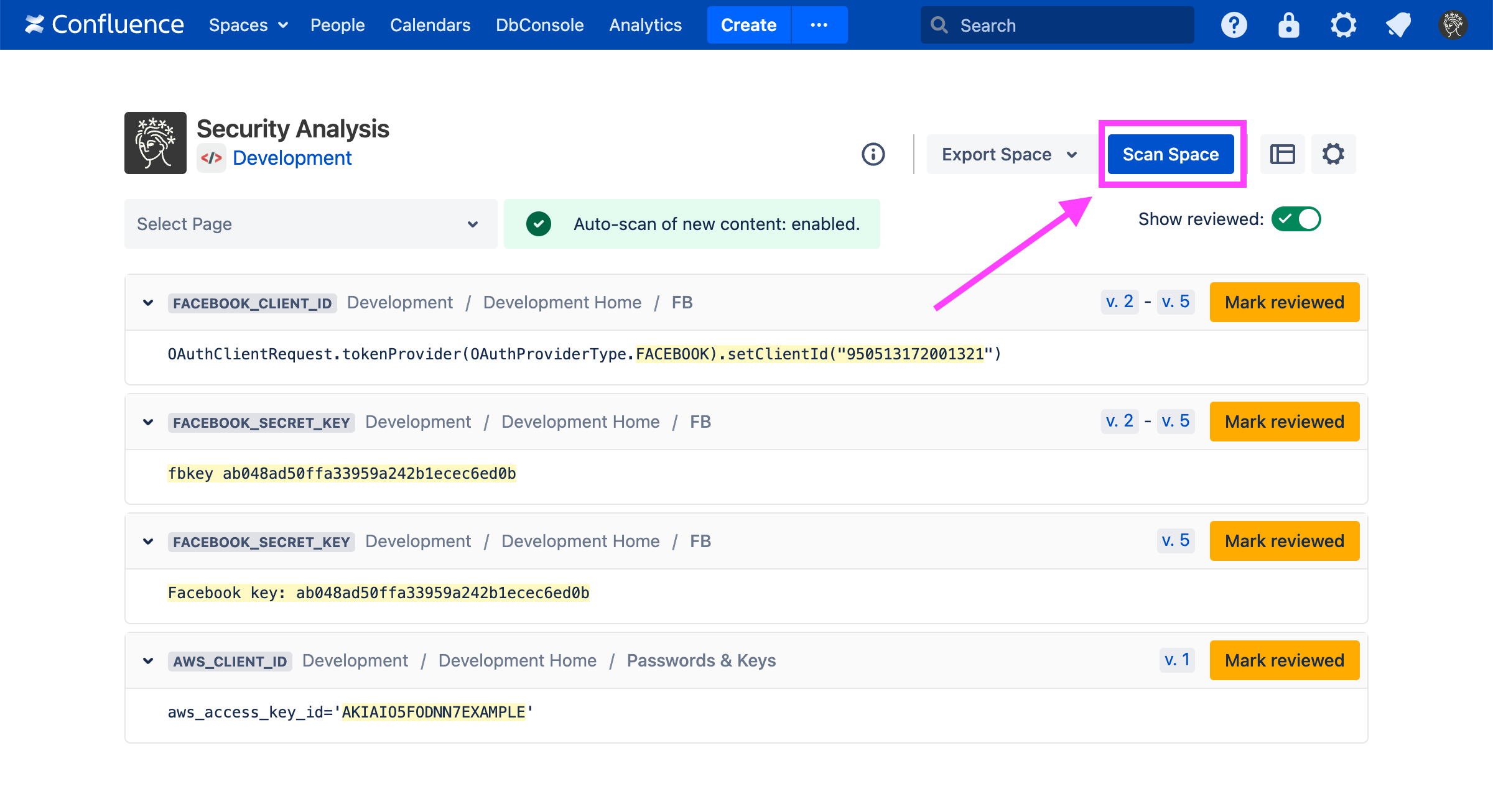 From the Security Analysis page, you can view and disposition scan findings for that particular space, including hiding false positives. You may also trigger a scan using the “Scan Space” button: