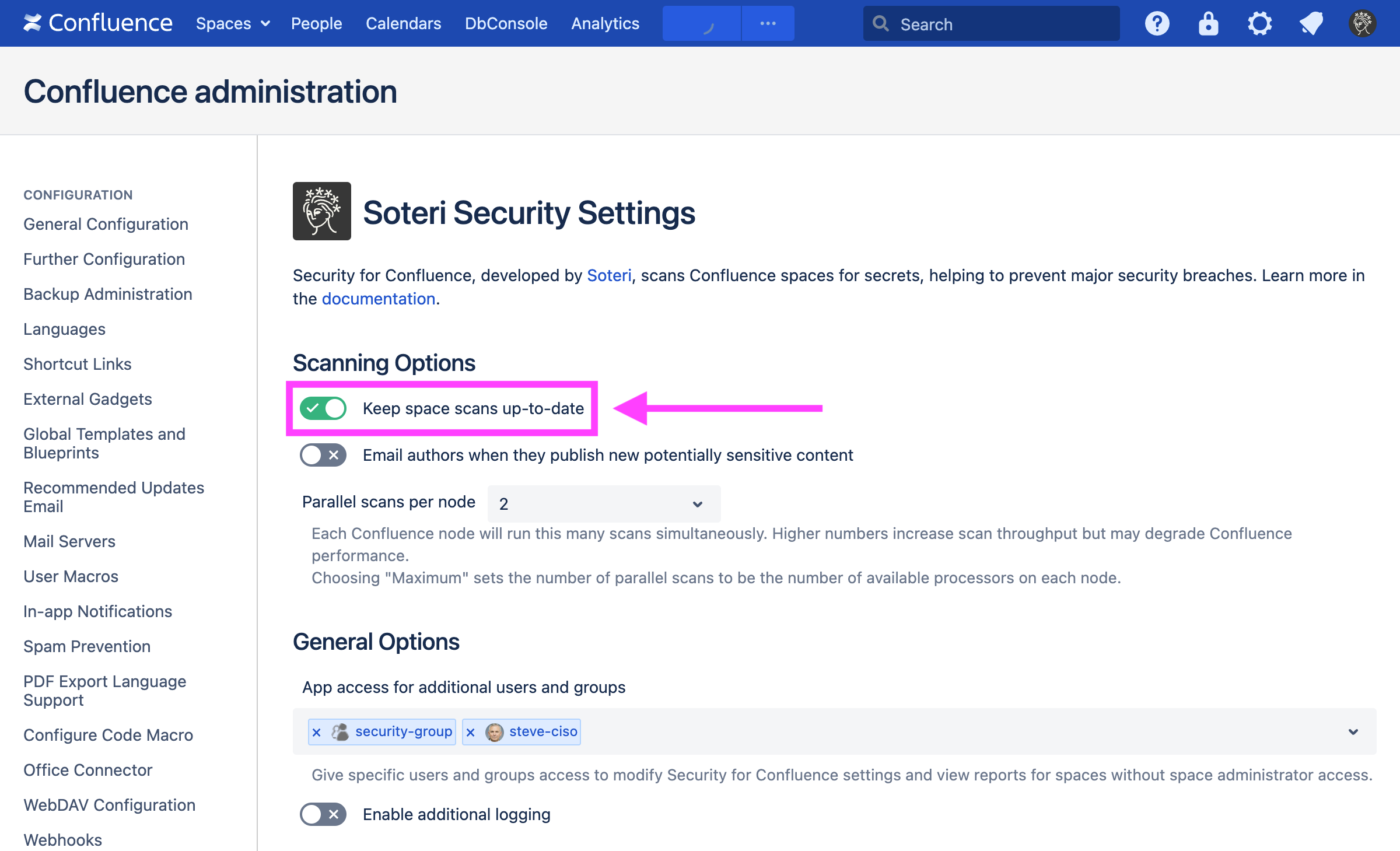 When auto-scanning is enabled, Security for Confluence can also notify content authors when they publish potentially sensitive information automatically. See Email notifications for content authors for more details.