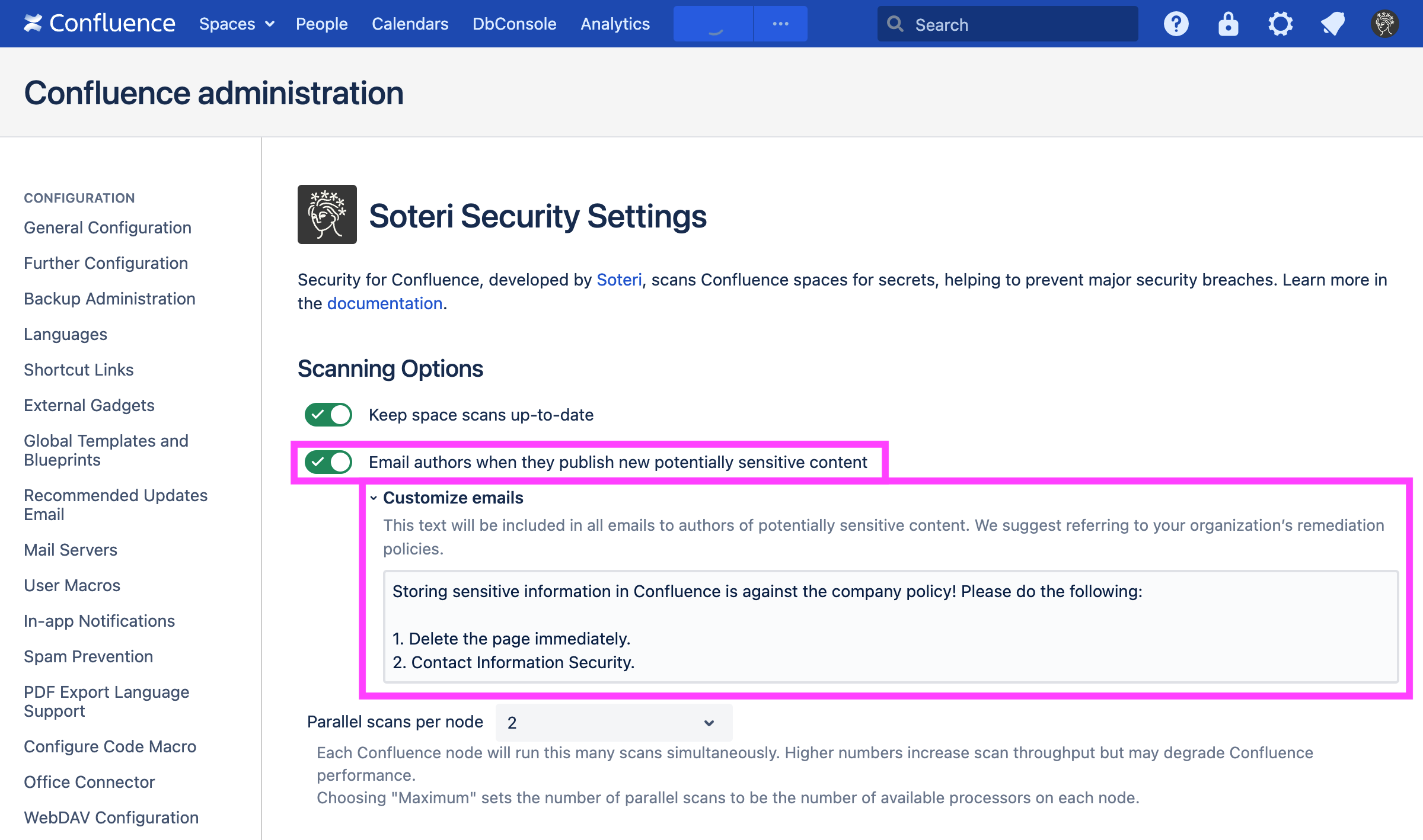 When Security for Confluence is configured to automatically scan new content, it can also send emails to authors of pages and blog posts notifying them when they publish potentially sensitive content. This functionality can be enabled by Confluence administrators, or any user granted explicit app access, on the Security for Confluence settings page.