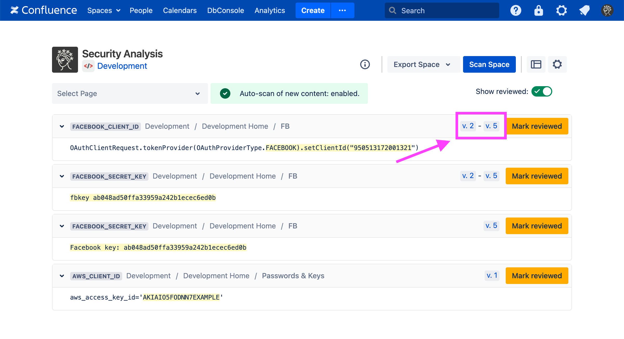 The space’s scan status and all findings in the space will be displayed. Similar findings in a single page’s history are grouped together. When a finding appears in multiple page versions, the range of page versions is shown.