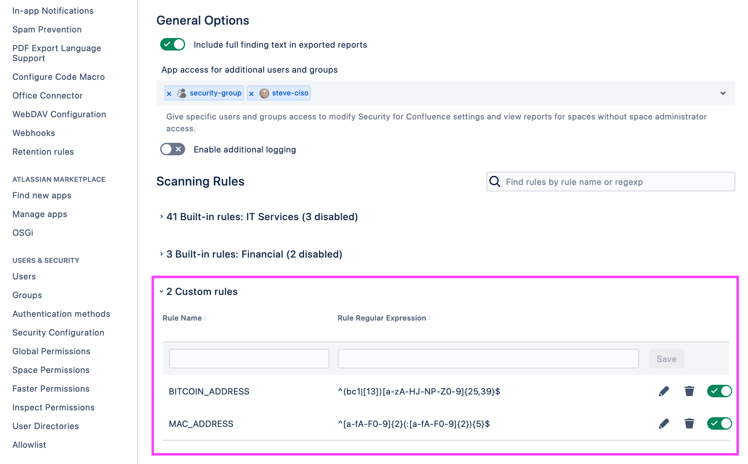 Security for Confluence allows you to create custom scanning rules using regular expressions. You can create and edit custom rules from the Settings page, under “Custom rules”: