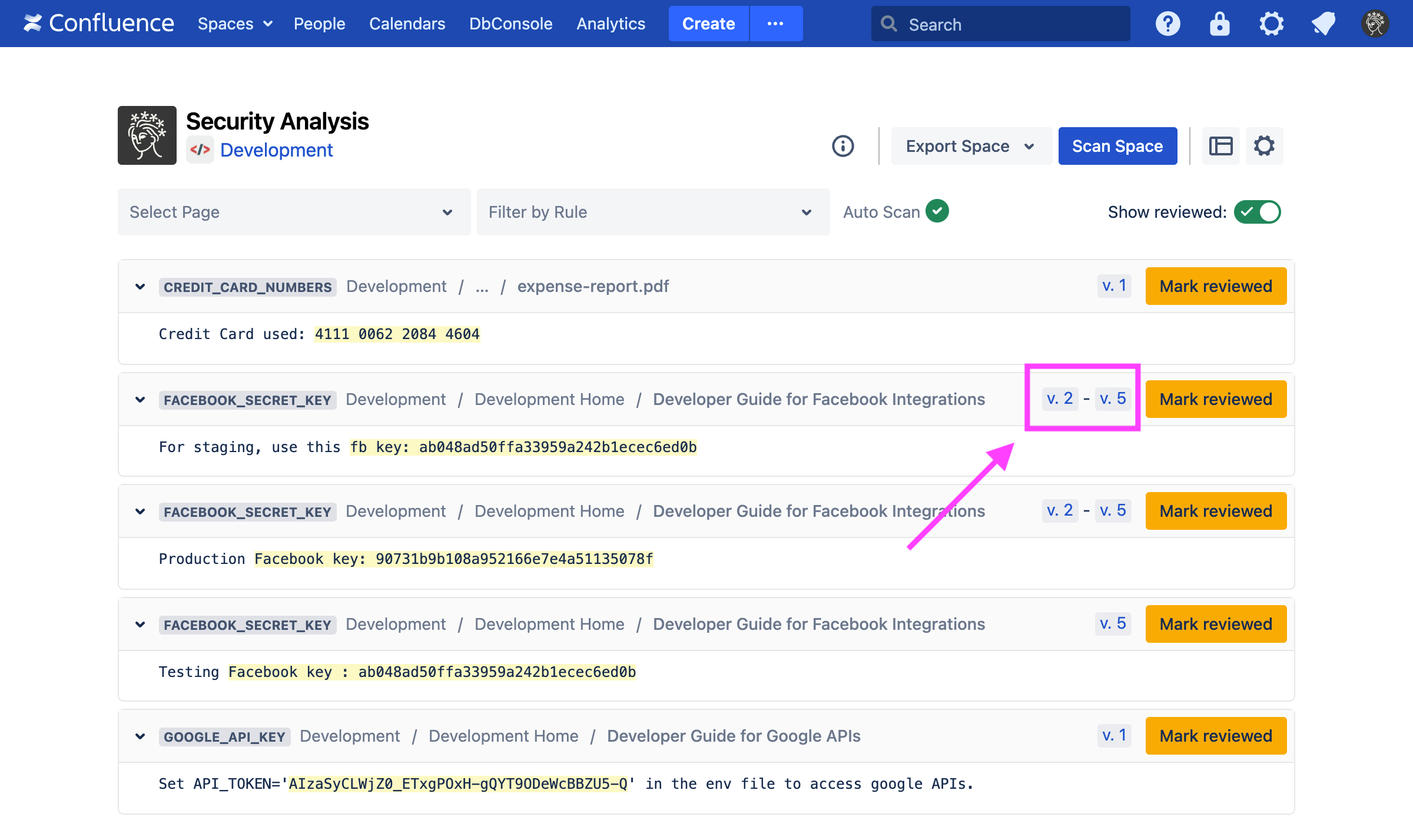 The space’s scan status and all findings in the space will be displayed. Findings with the same match text in a single page’s or attachment’s history are deduplicated. When a finding appears in multiple content versions, the range of versions is shown.