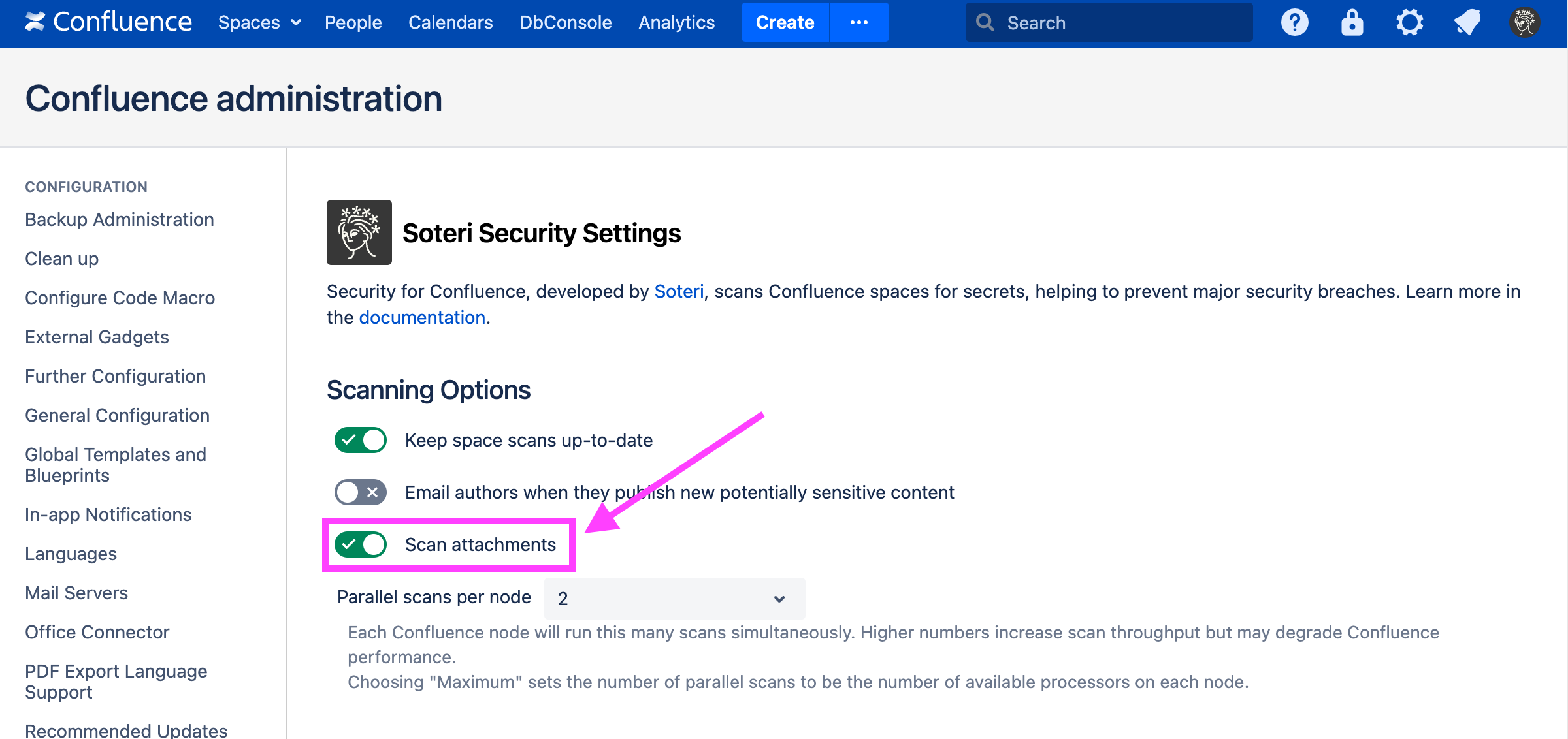 By default, Security for Confluence scans files attached to pages or blog posts.