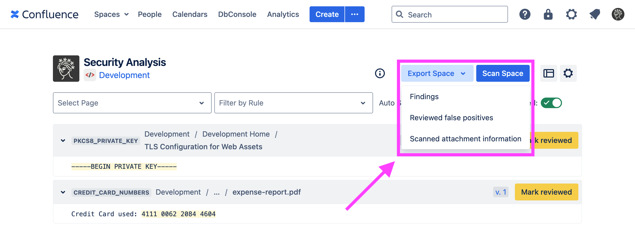 You can also export findings for a particular space or for all spaces for which you have administration privileges, using the REST API.