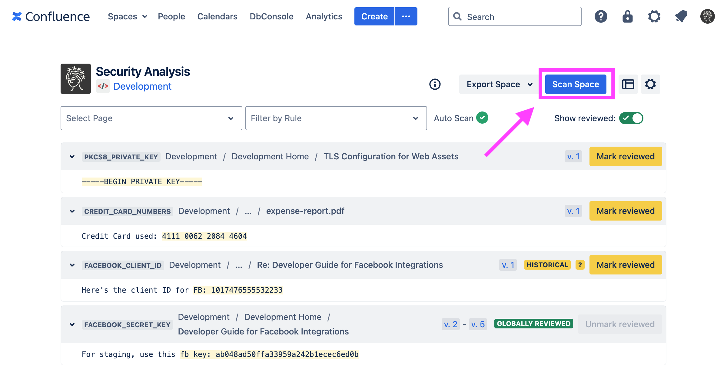 From the Security Analysis page, you can view and disposition scan findings for that particular space, including hiding false positives. You may also trigger a scan using the “Scan Space” button: