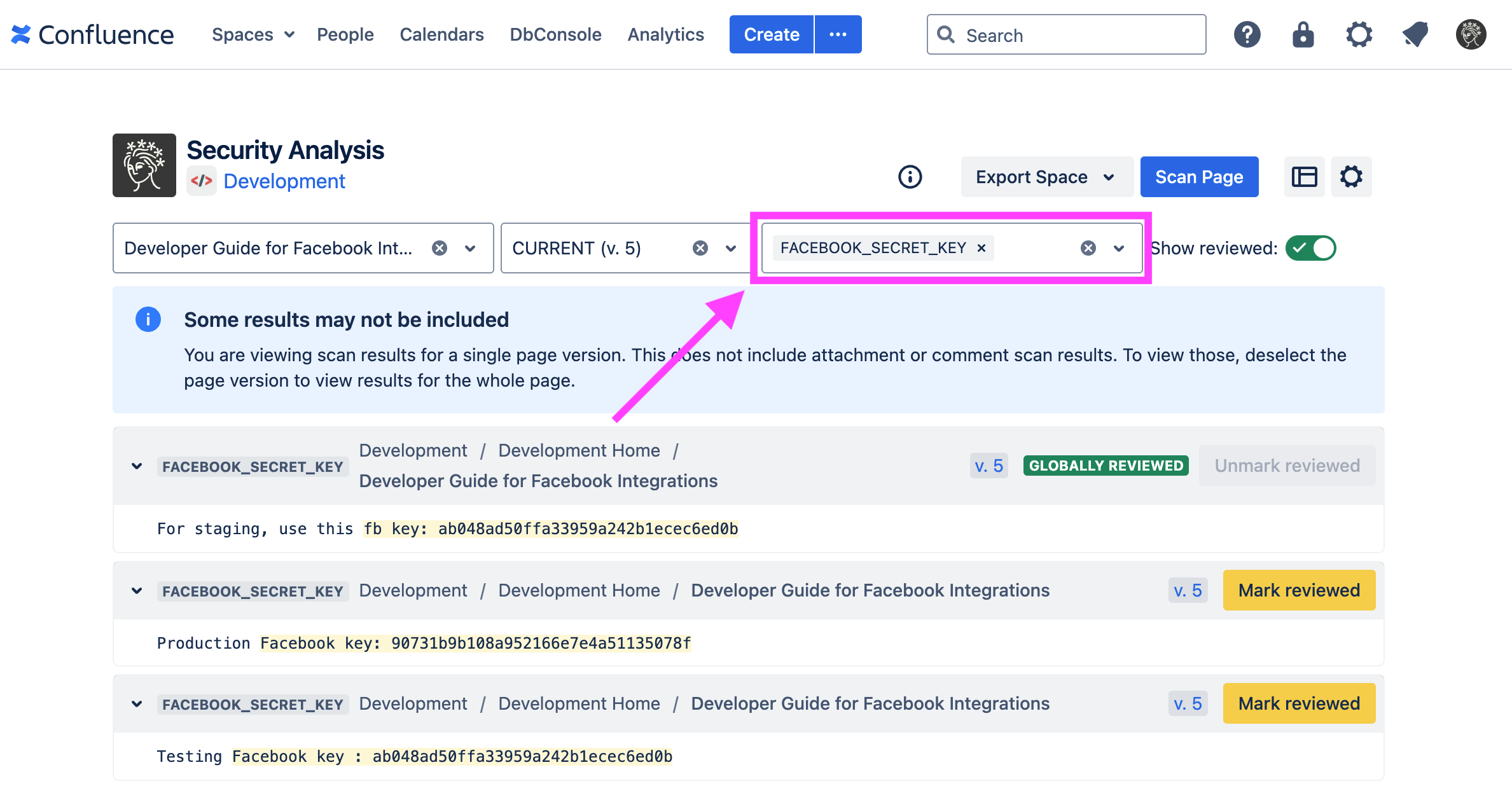When a page version is selected, only scan findings in the text of that specific version are shown. Findings in attachments or comments on the page are not included.