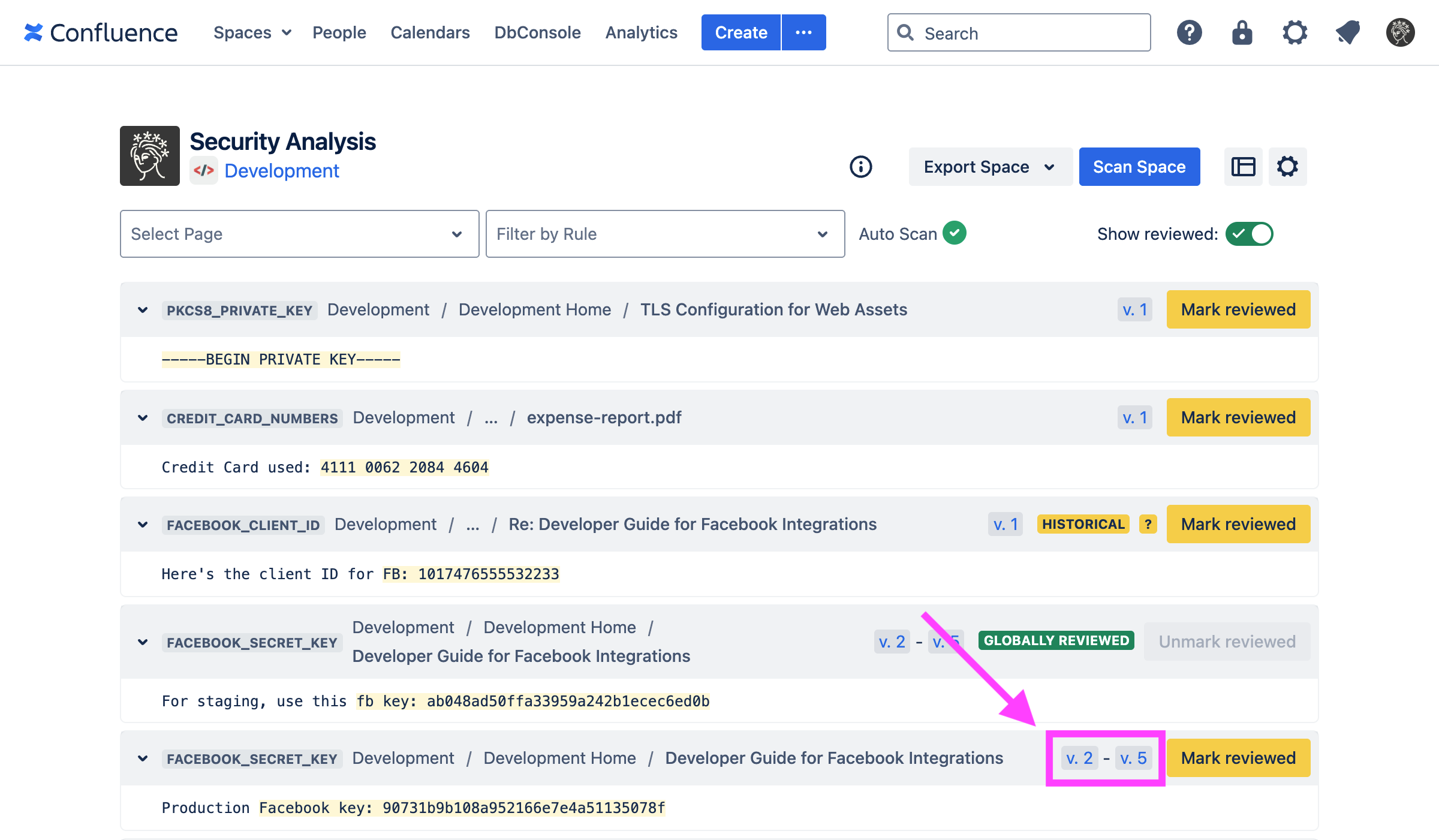 The space’s scan status and all findings in the space will be displayed. Findings with the same match text across multiple versions of a piece of content are deduplicated—that is, when a finding appears in multiple content versions, the range of versions is shown.