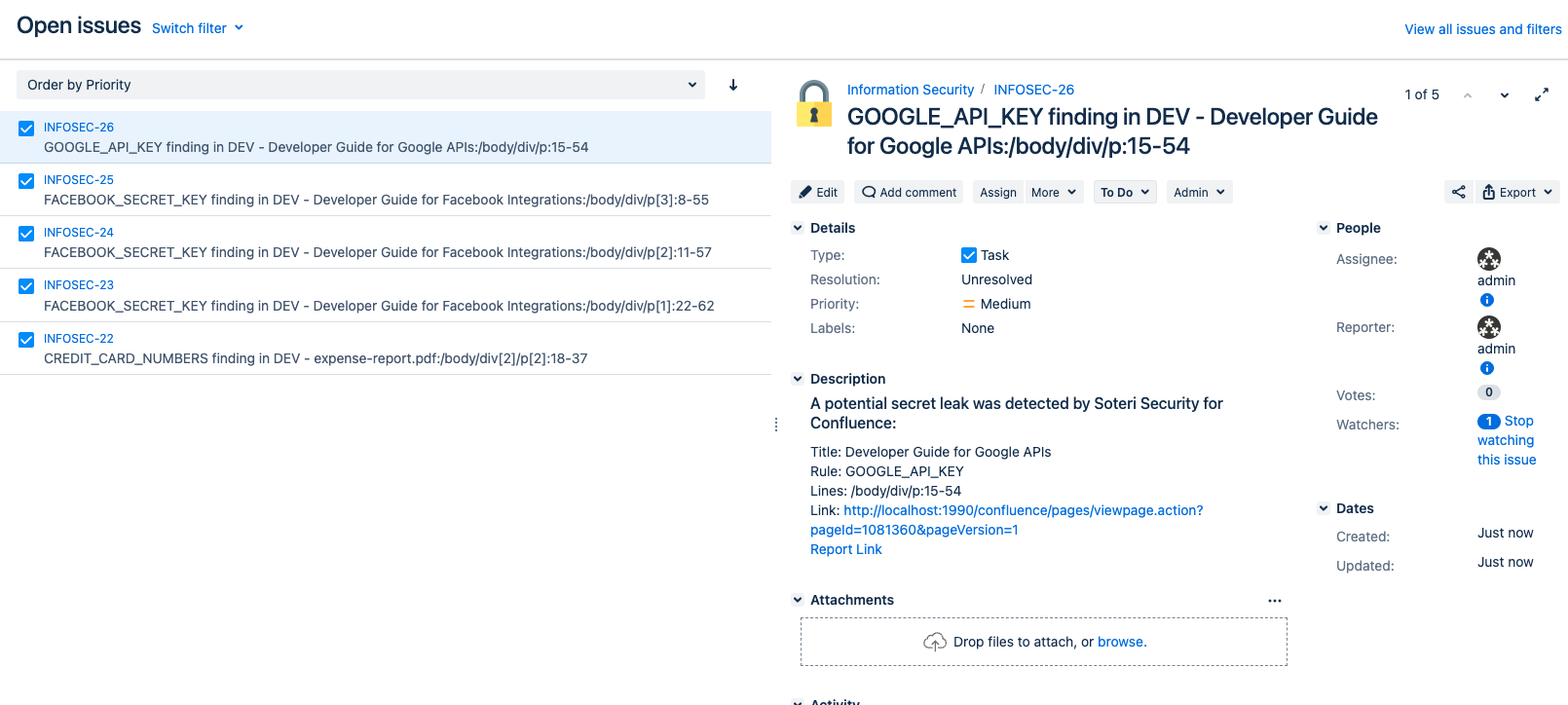 While Security for Confluence provides a rich interface for processing your findings, it may be the case that utilizing a Jira project with tickets for each finding fits with your organizational goals in terms of metrics and disposition frequency. For example, Jira tickets allow comments where the person who processes the finding can track the work required to rotate a secret, or track the nuance in a particularly odd false-positive, or provide a custom outcome when a finding is marked “Reviewed”. Jira tickets can also be linked to other related projects easily, which could allow them to be delegated to teams responsible for the affected content itself, for example.