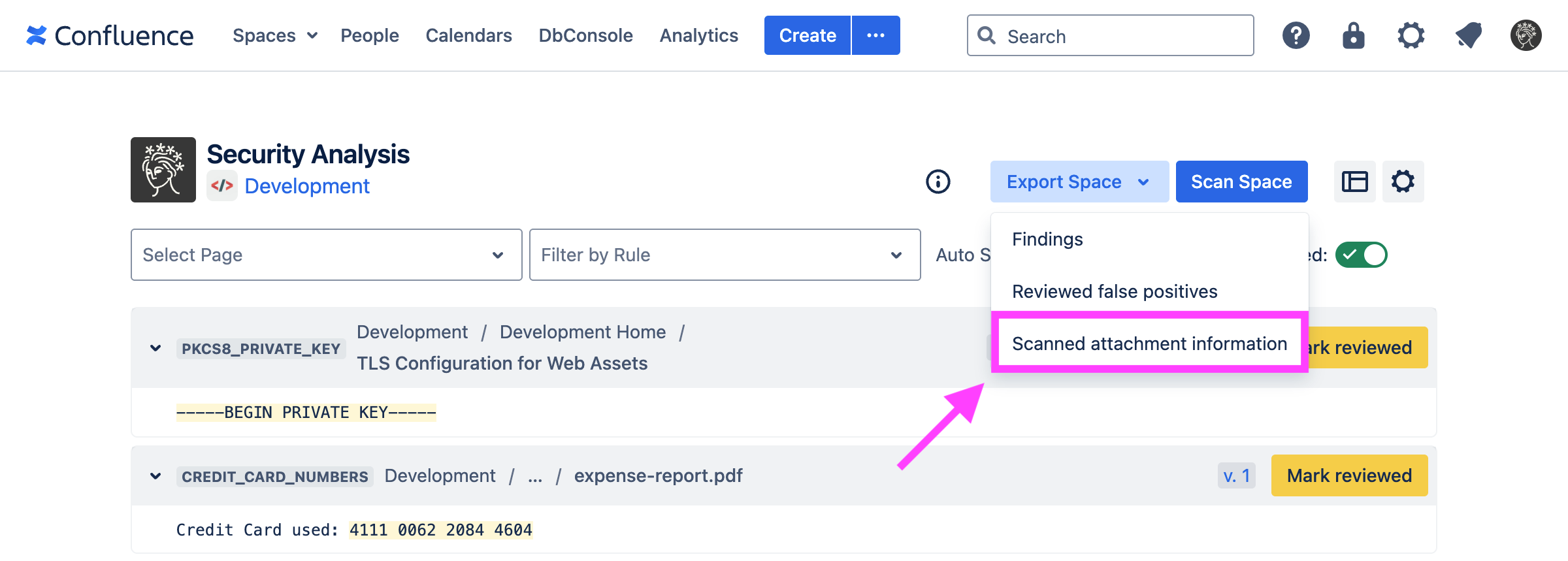 From the Security Analysis page, you can export attachment scan information for a specific space: