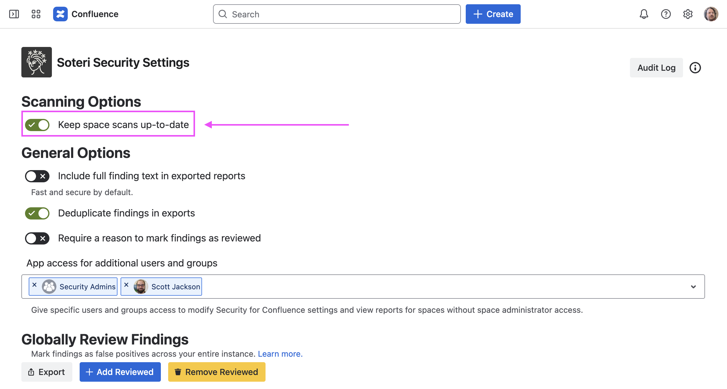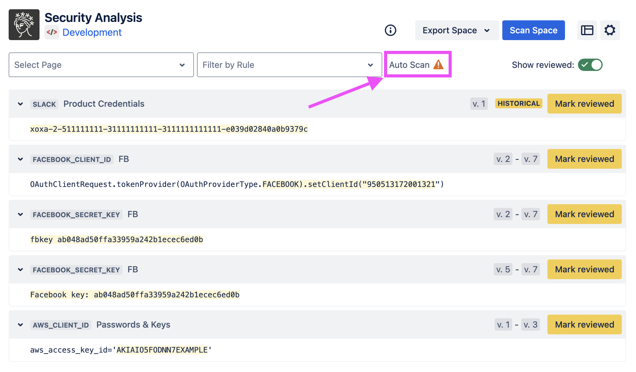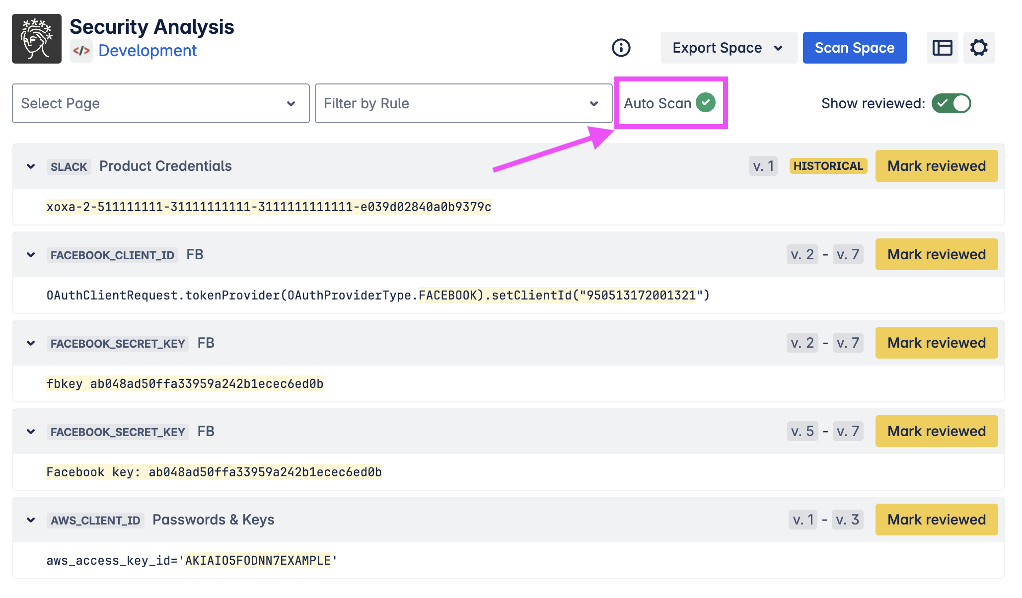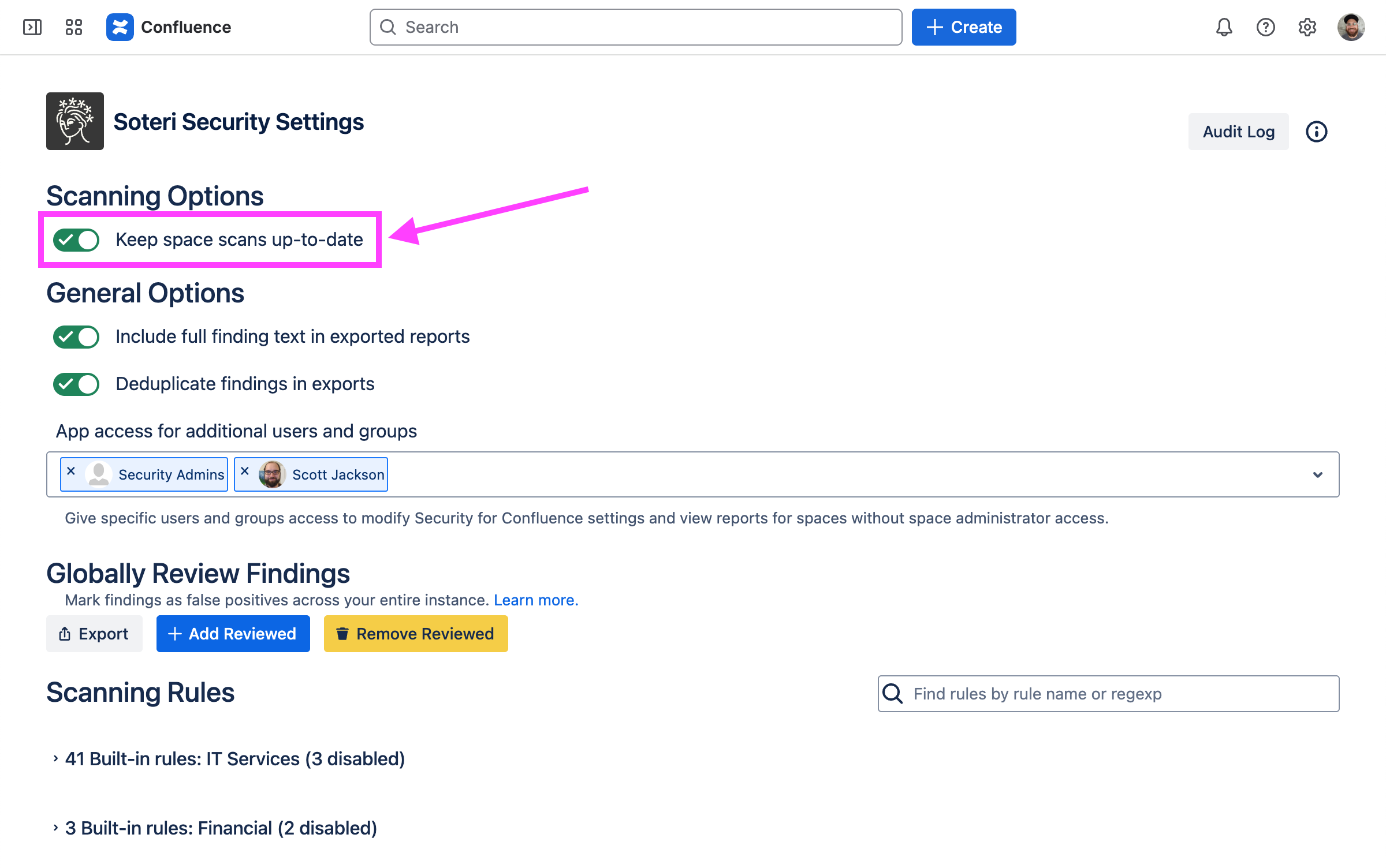 By default, Security for Confluence automatically scans new and updated content. Scanning is triggered for newly created spaces and extends to other content, including all new or updated pages and blog posts within previously scanned spaces.