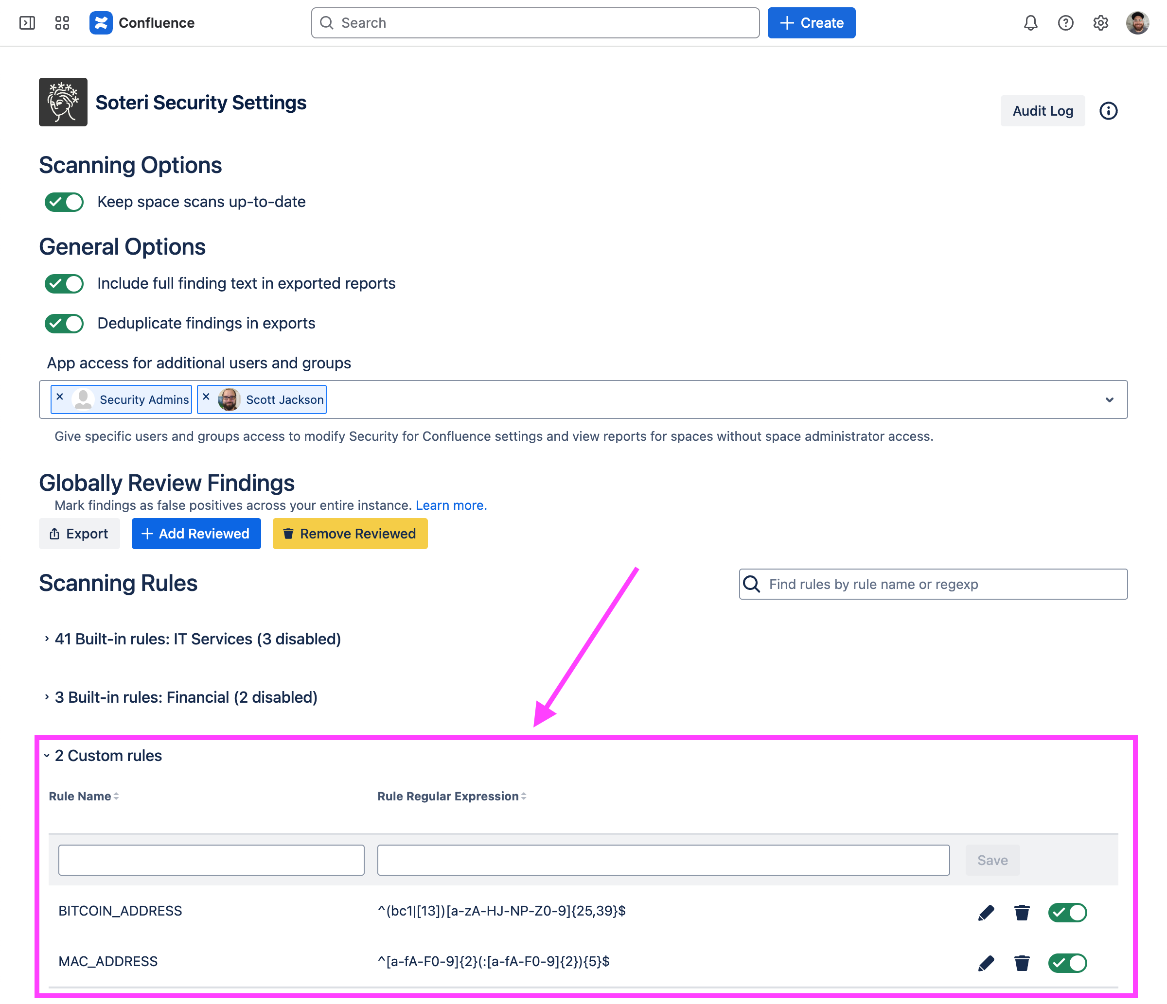 Security for Confluence allows for creation of custom scanning rules using regular expressions.
