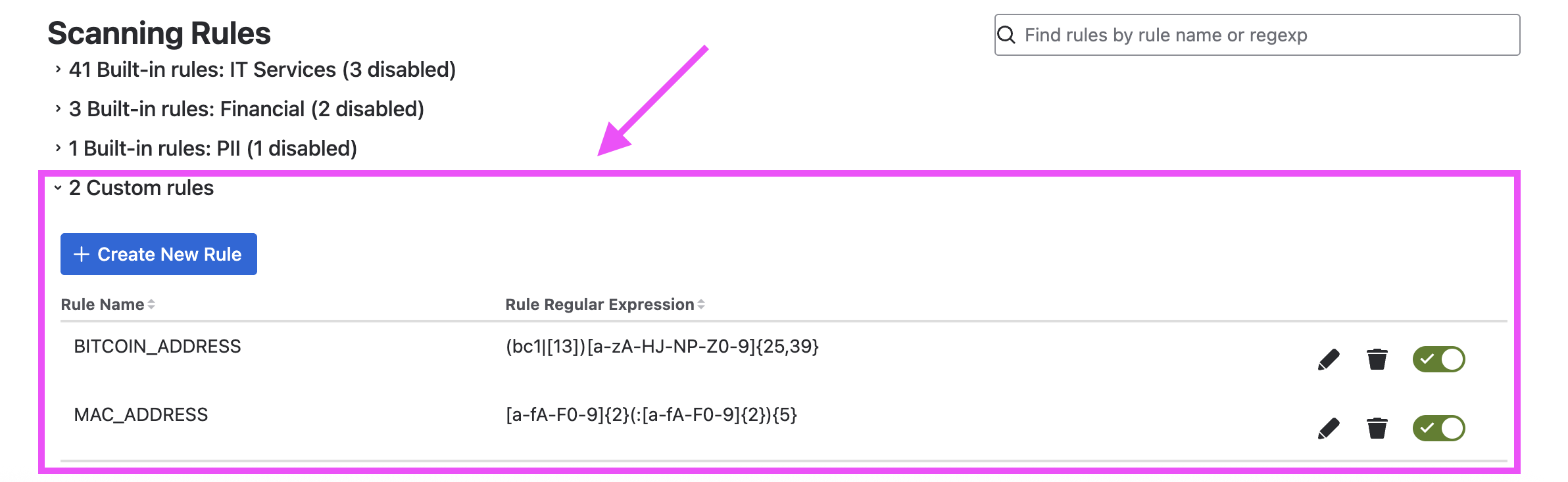 When creating or modifying a custom regex rule, a preview of matches that would be caught by a scan will be shown.