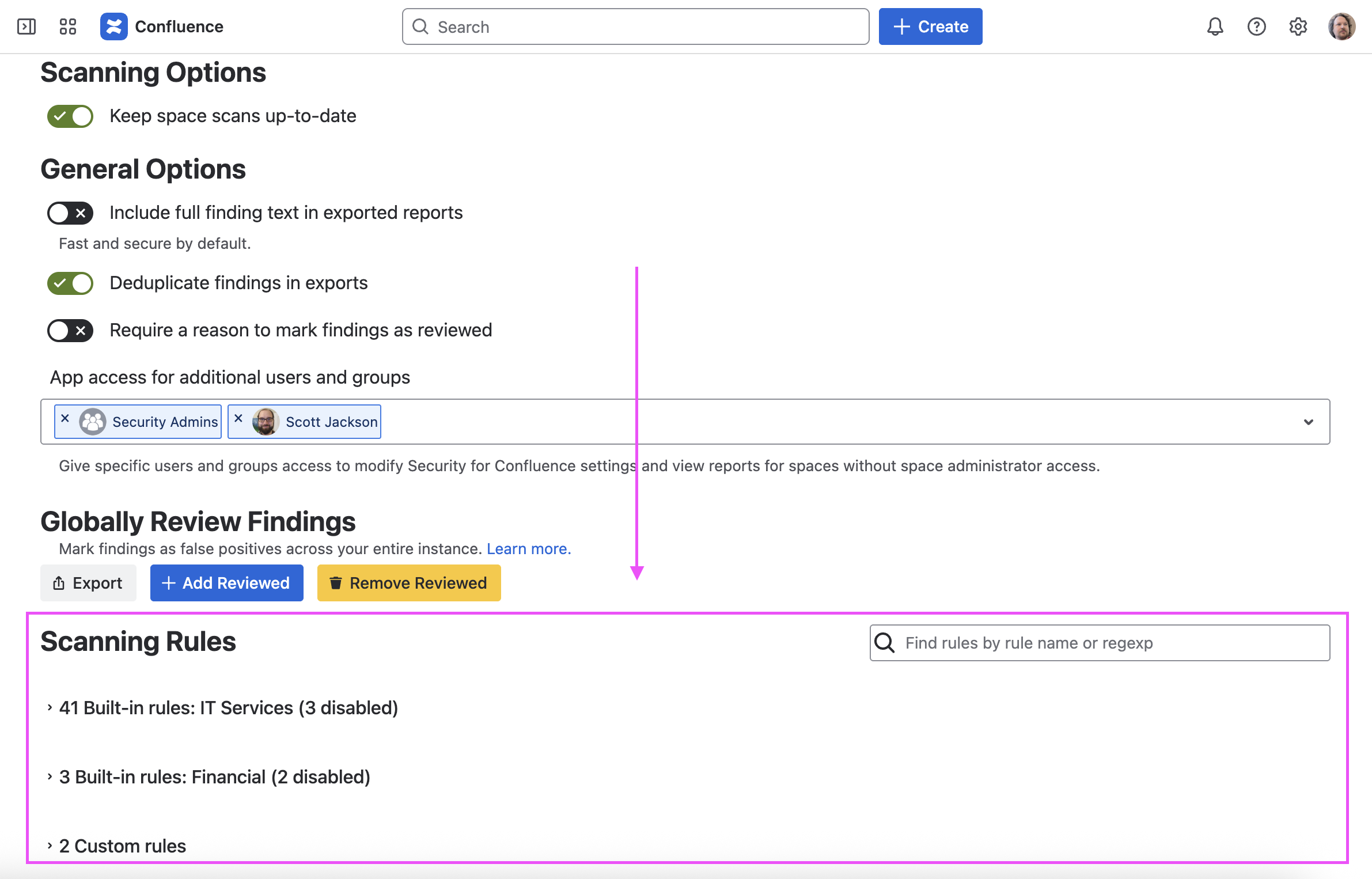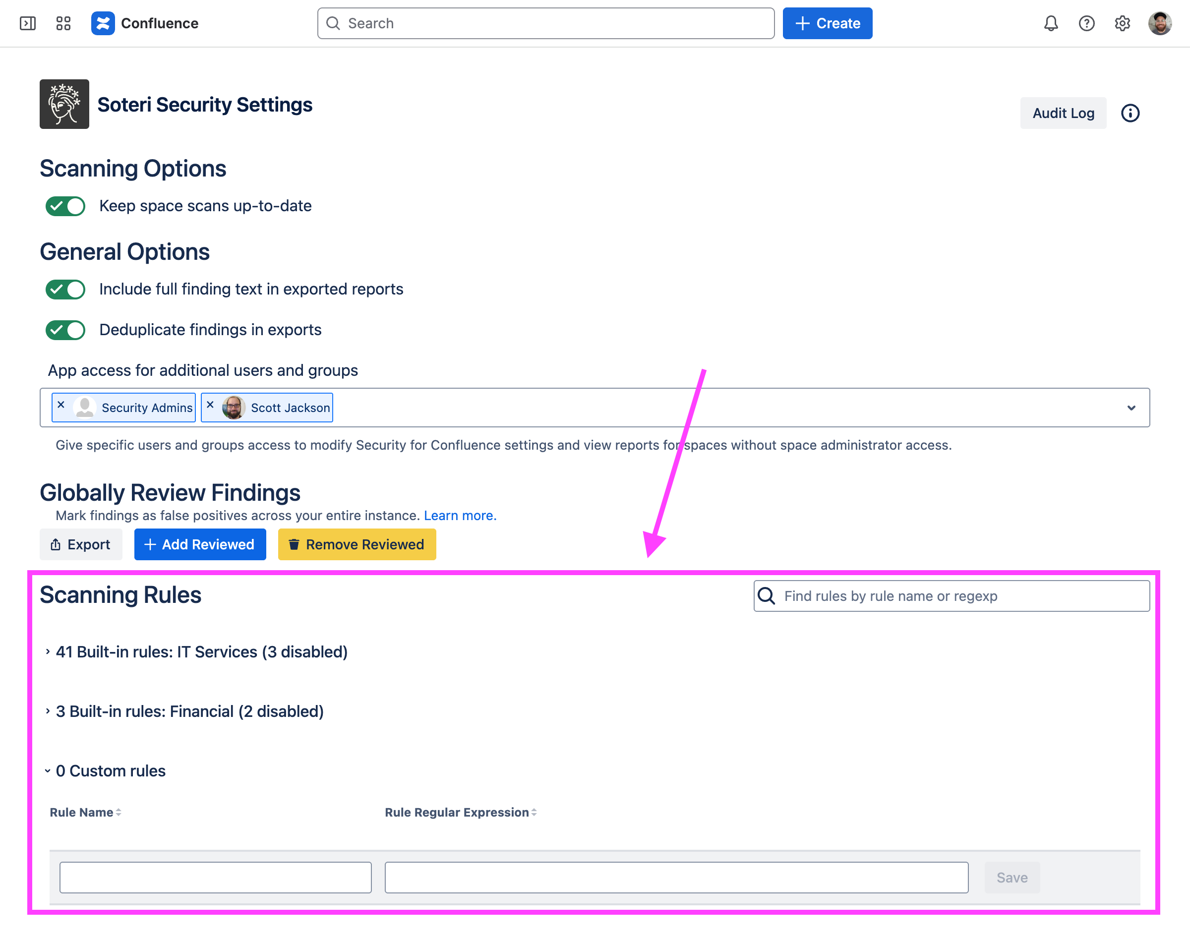 Soteri Security for Confluence allows for customizing which security rules are used for scanning in order to fit the needs of your organization.