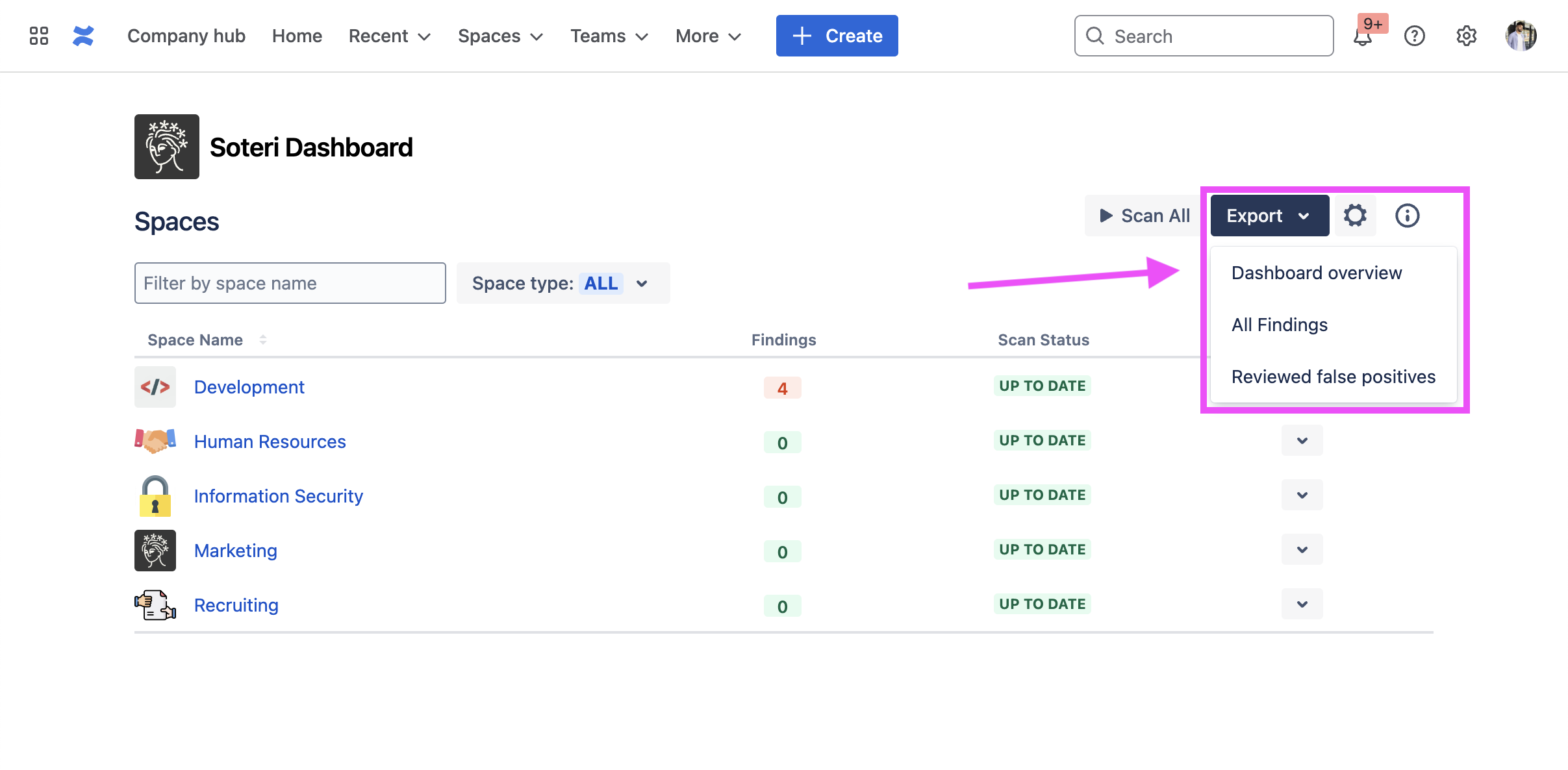 To export all findings for all spaces for which you have administration privileges, click the Export button at the top of the Soteri Dashboard: