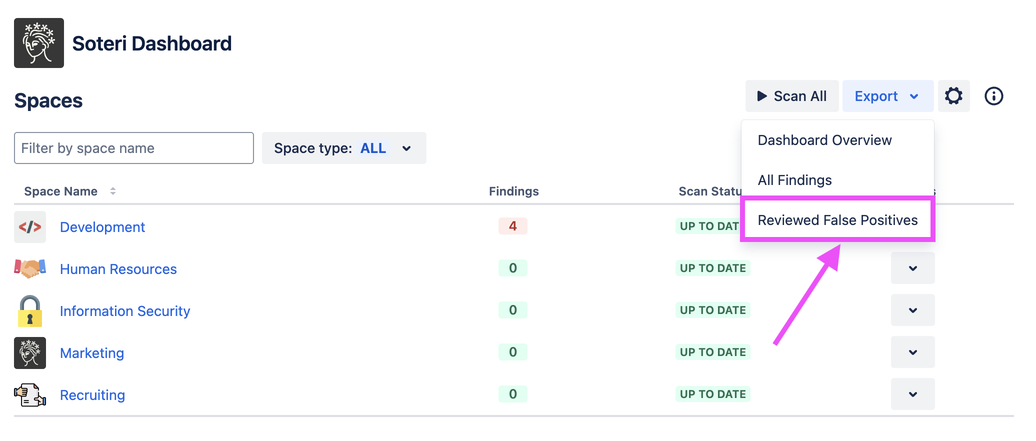 You can also export reviewed false positives in all your spaces from the Soteri Dashboard.
