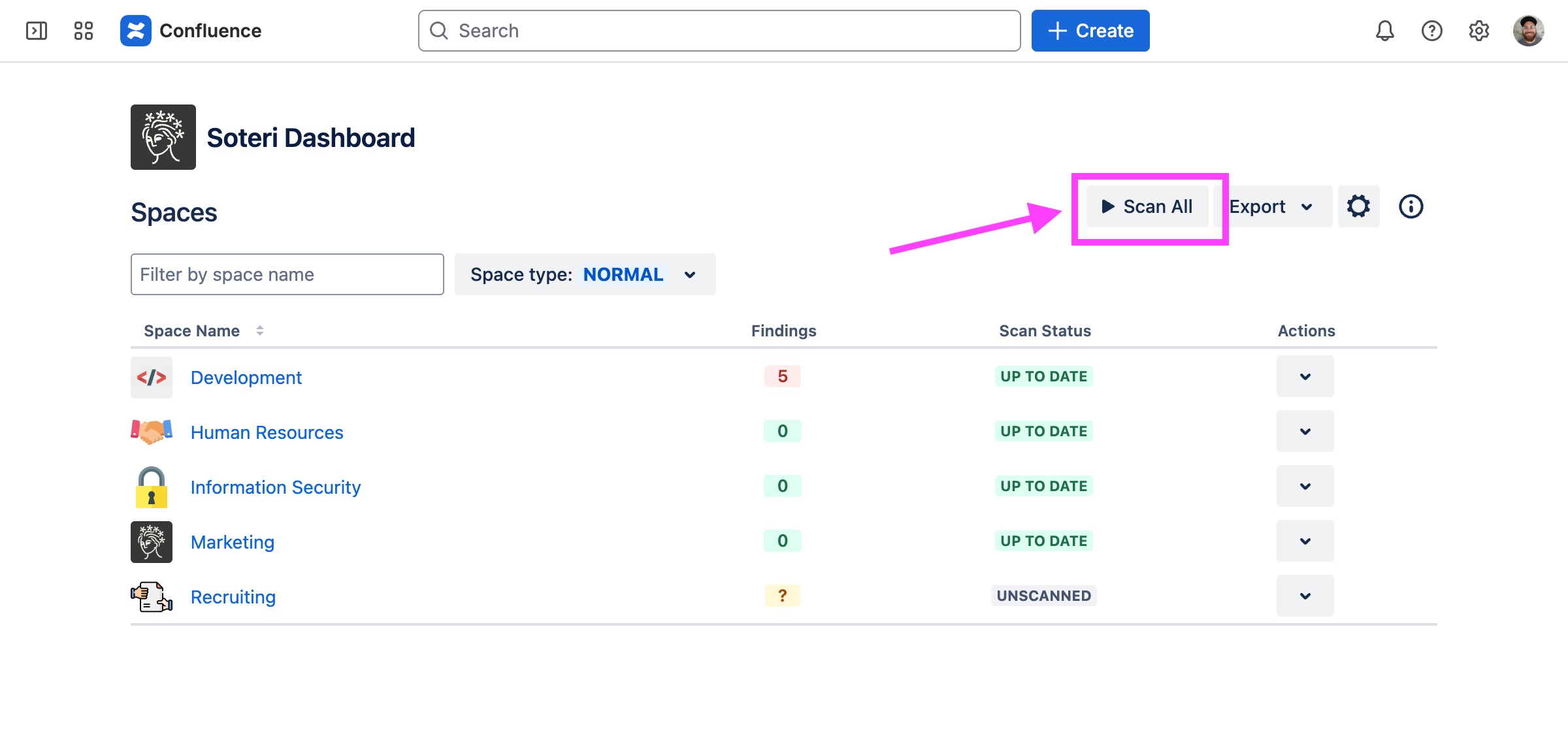 Scans may be triggered for spaces individually or, if you are a Confluence administrator, all at once. The easiest way to do either is via the Soteri Dashboard.