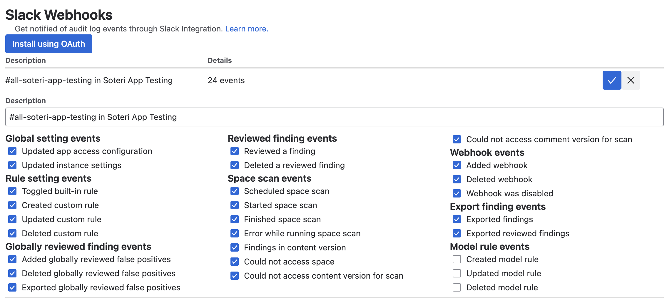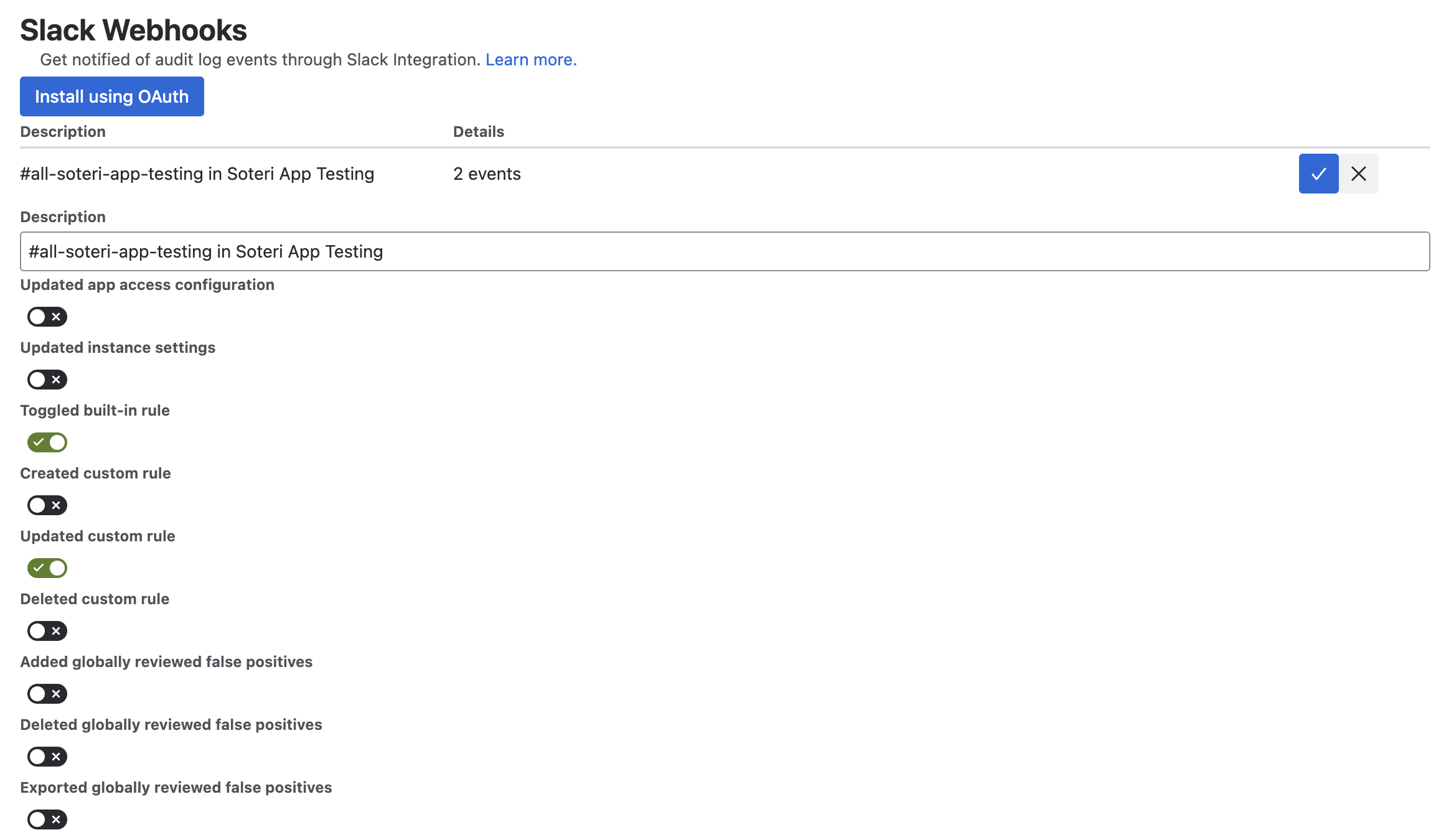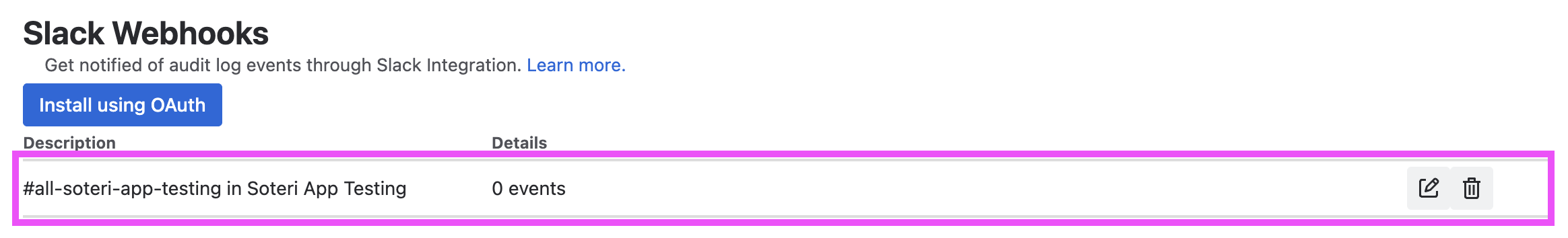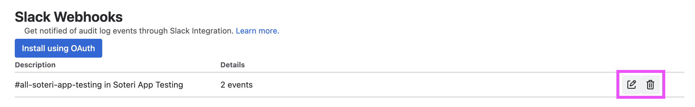 Once your webhook is created, you can click the edit button to select which audit log events to receive messages for, or to edit the description. Clicking the trash icon removes the webhook.