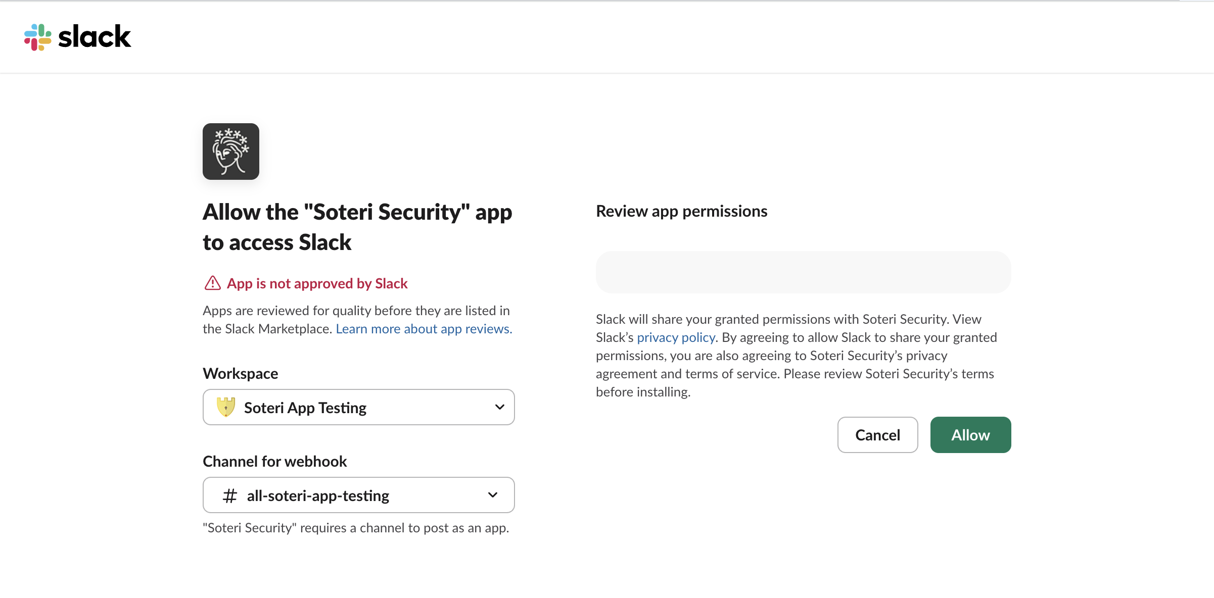 Clicking the “Install using OAuth” button installs our Slack app using OAuth. A pop-up will open, where you can select the workspace and channel that messages will be sent to.