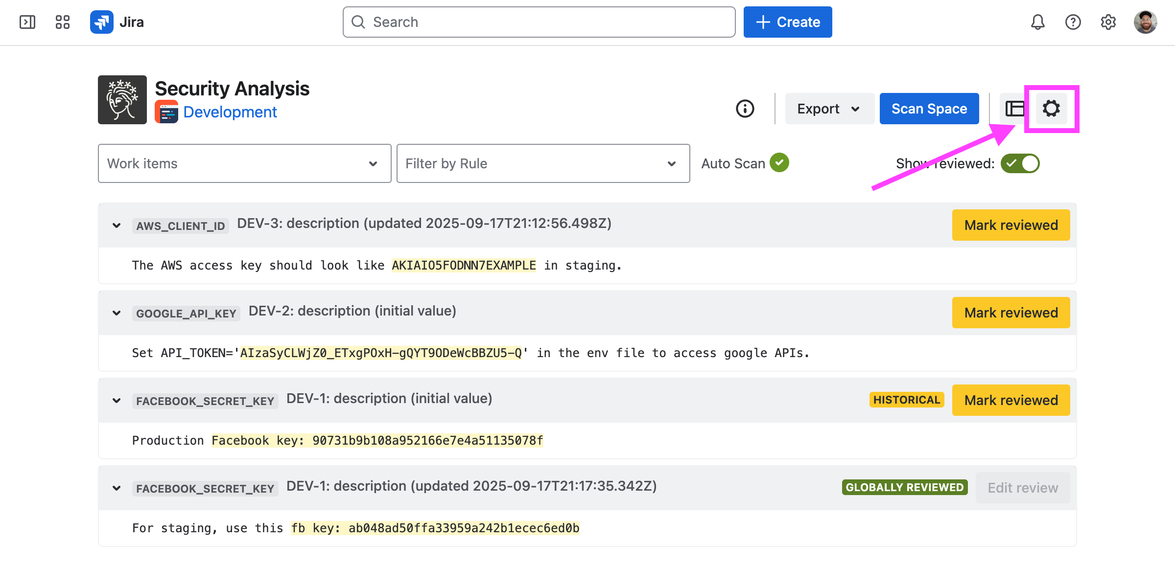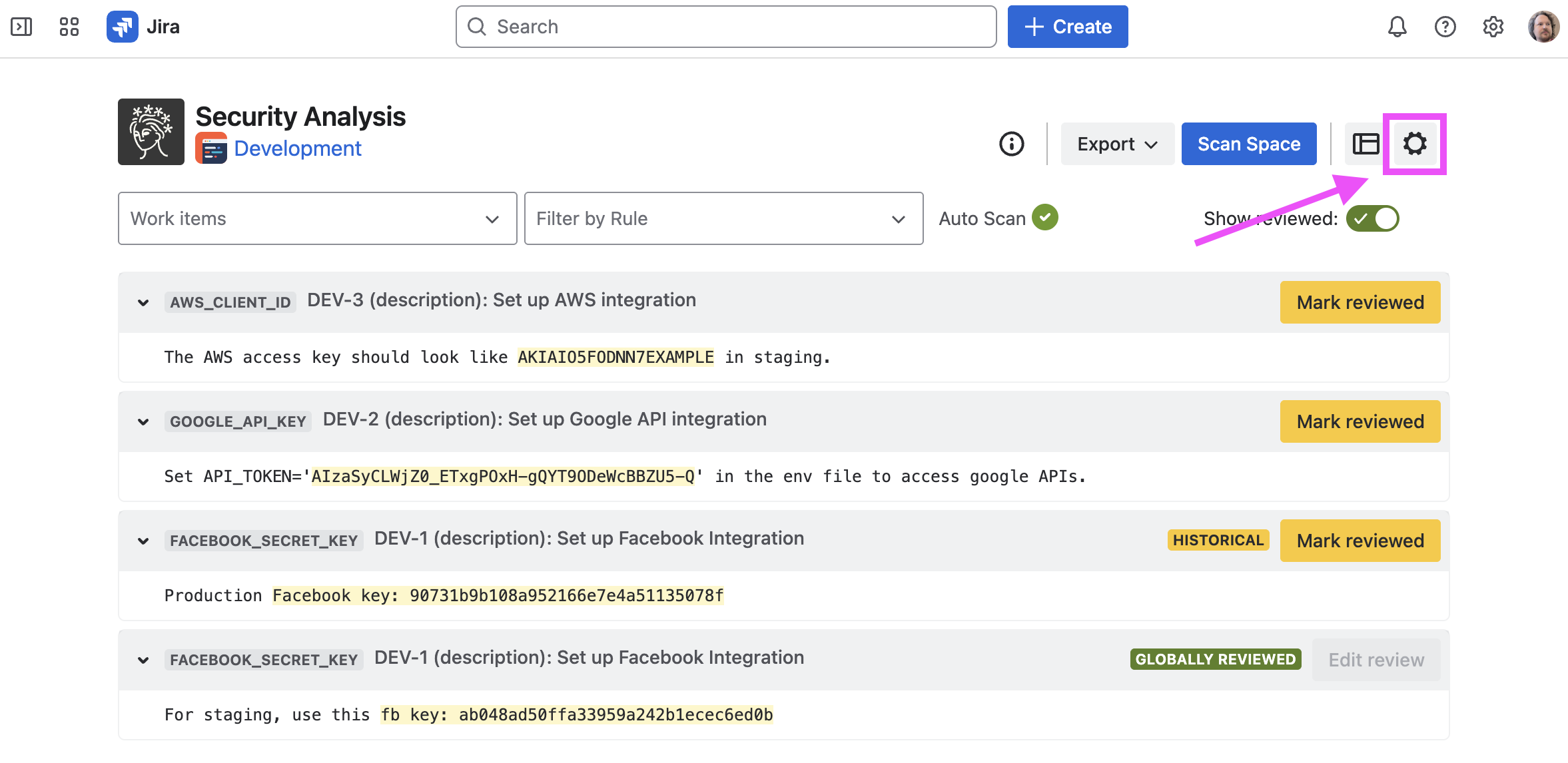 The settings page can be accessed from a space’s Security Analysis, by clicking the gear icon: