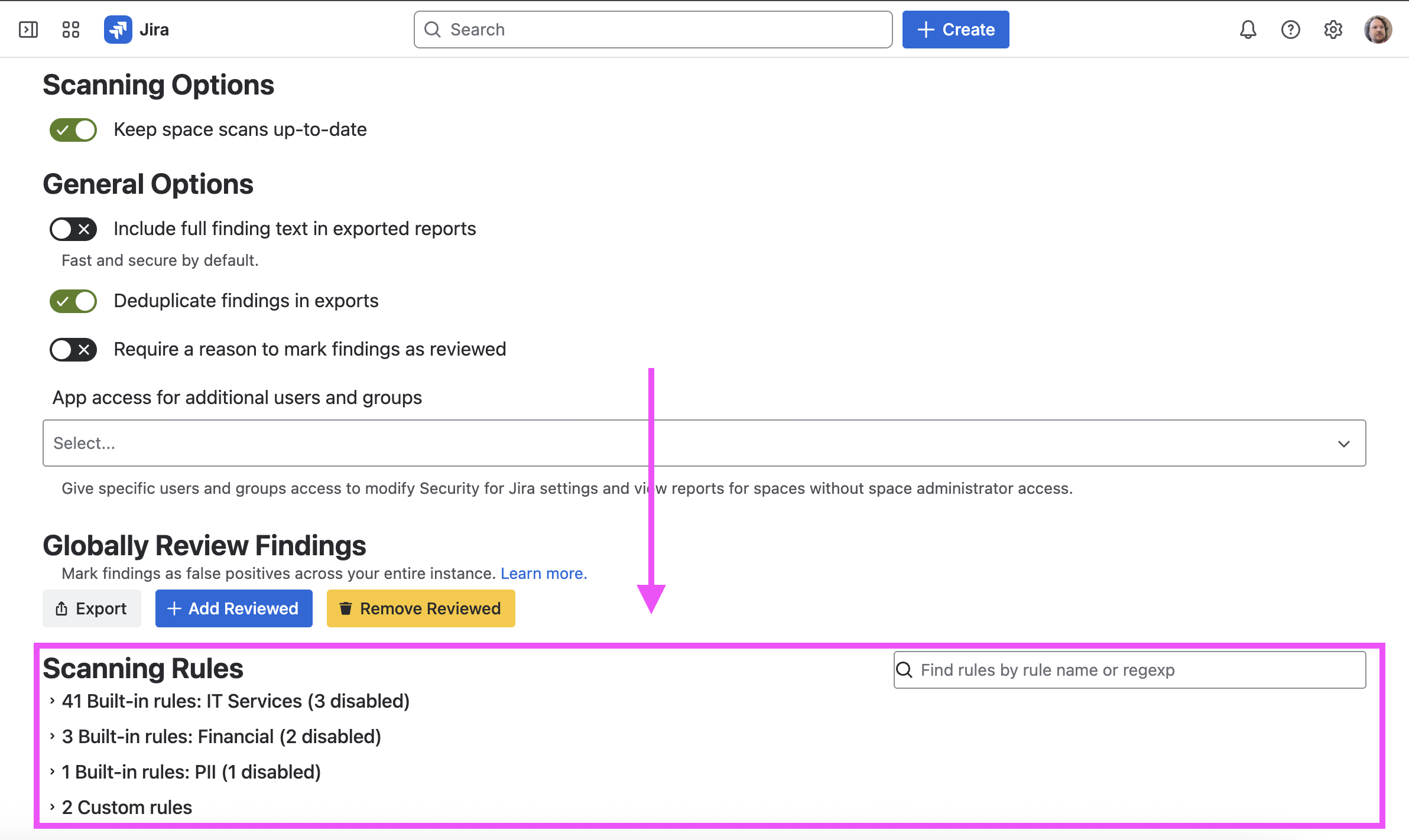 Soteri Security for Jira allows for customizing which security rules are used for scanning in order to fit the needs of your organization.