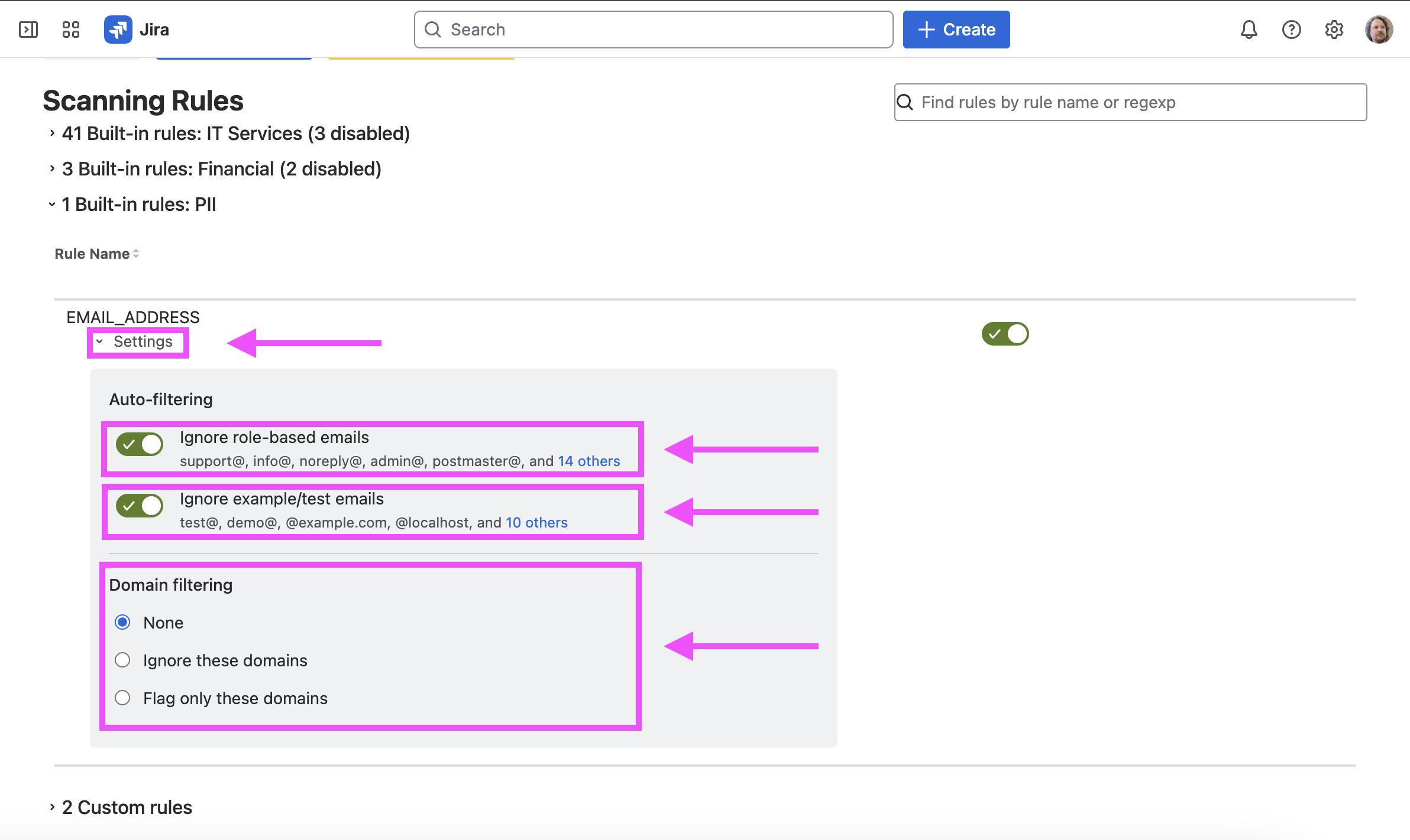If the EMAIL_ADDRESS rule is turned on, there are further settings that can be adjusted to fine tune what is detected.