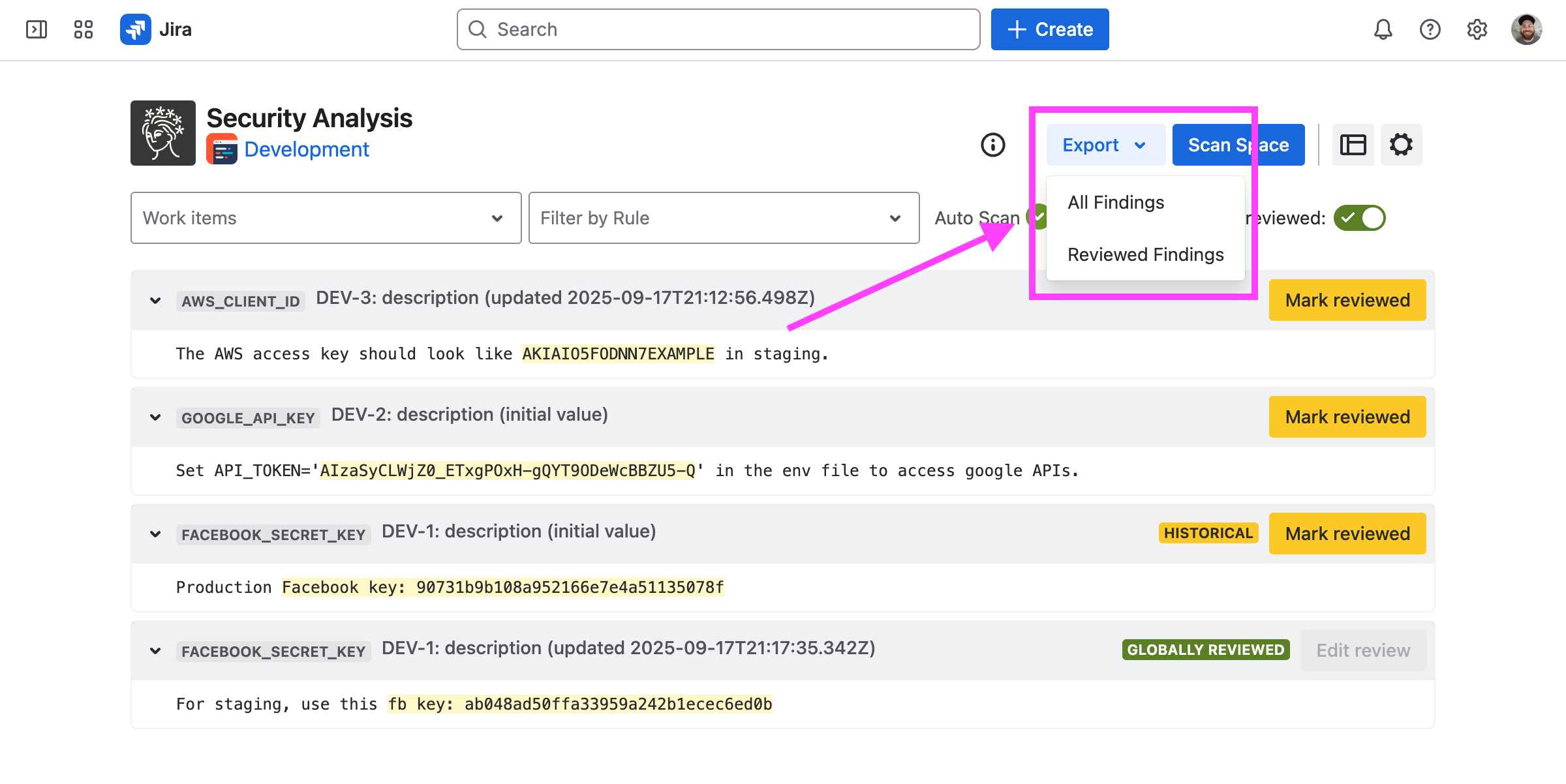 A Reviewed Findings export contains reviewed findings, including who reviewed them and when they were reviewed. Reviewed findings that are scoped to a space will apply to all future and past findings in the space that match exactly.