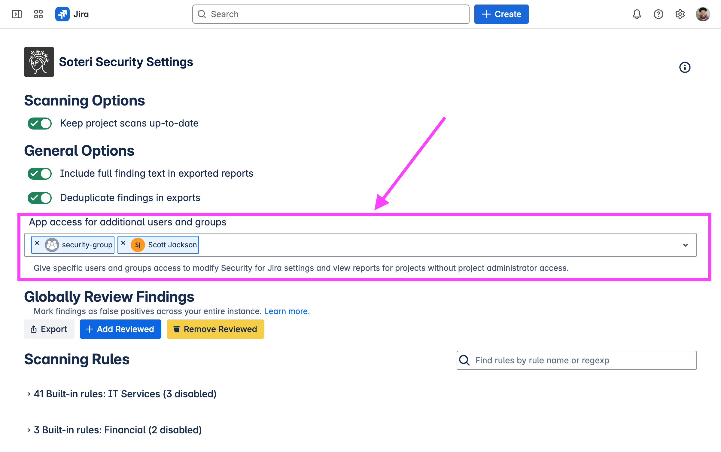 You may grant additional users and groups the ability to become App Administrators, which will allow them to view finding reports, mark findings reviewed, and change settings in the Security for Jira setting page.