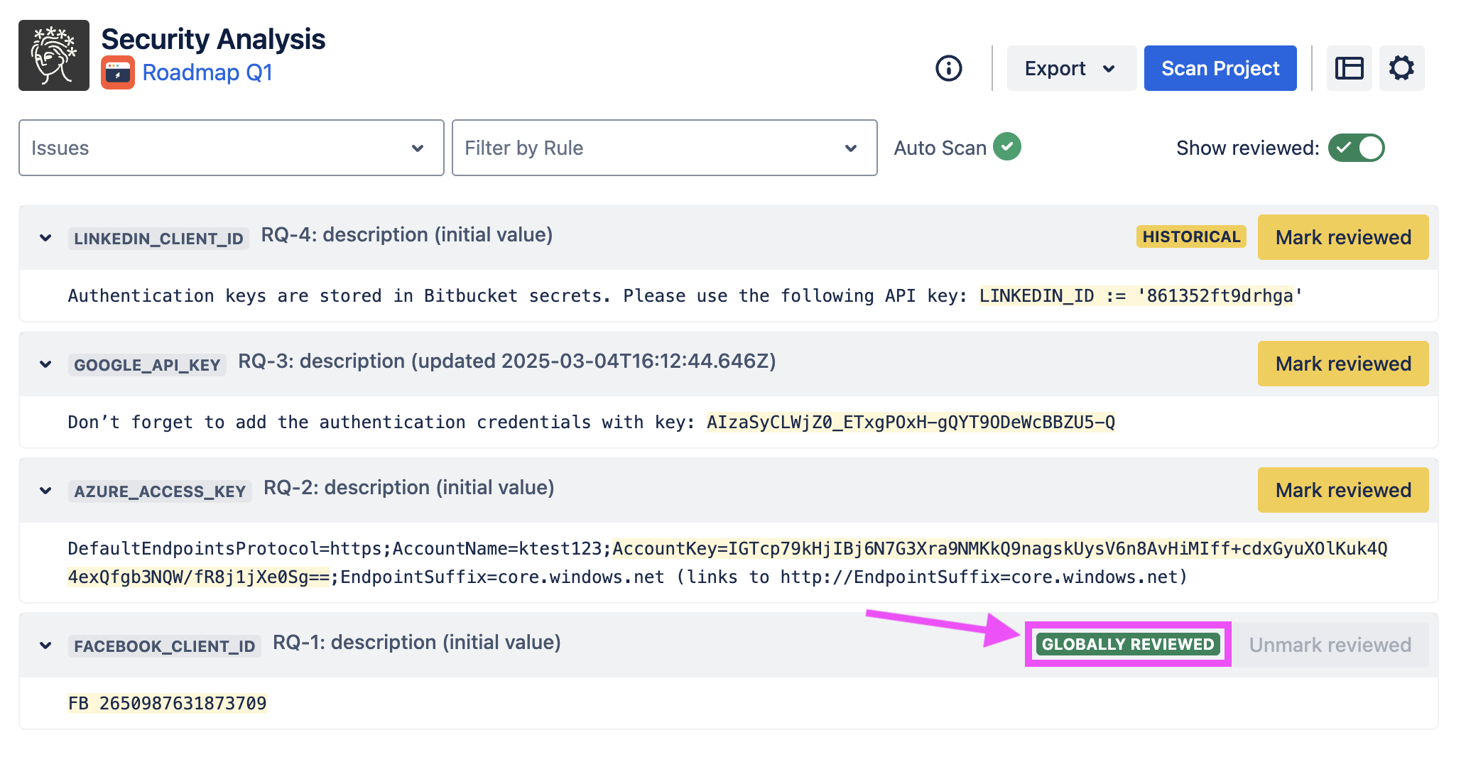 Project administrators and Jira administrators can review findings from a project’s Security Analysis page. Reviewed findings are scoped to the project the finding is in.