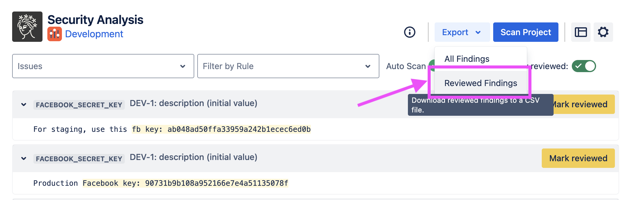 Information about reviewed findings for a project, such as who marked them reviewed and when, can be exported by choosing Reviewed Findings from the Export dropdown on the Security Analysis page.