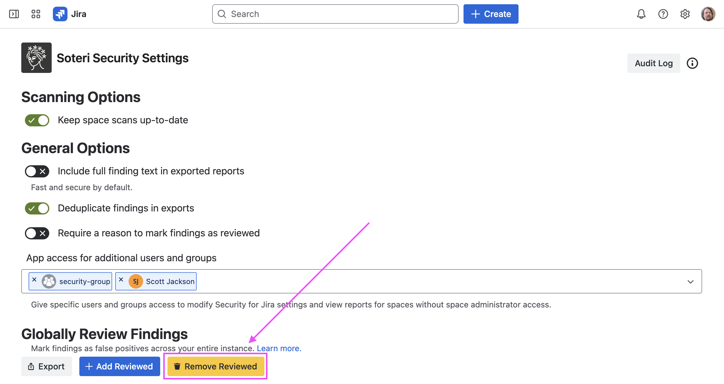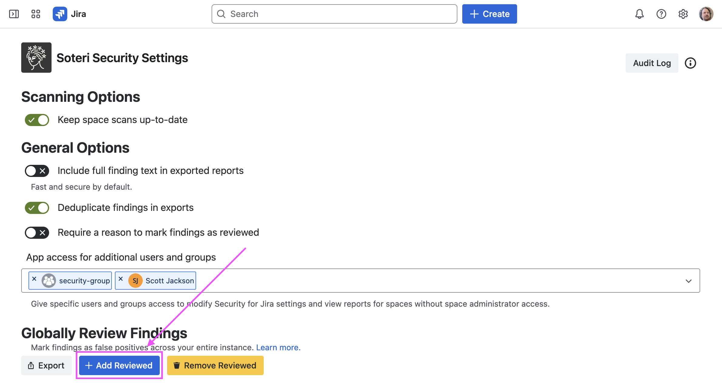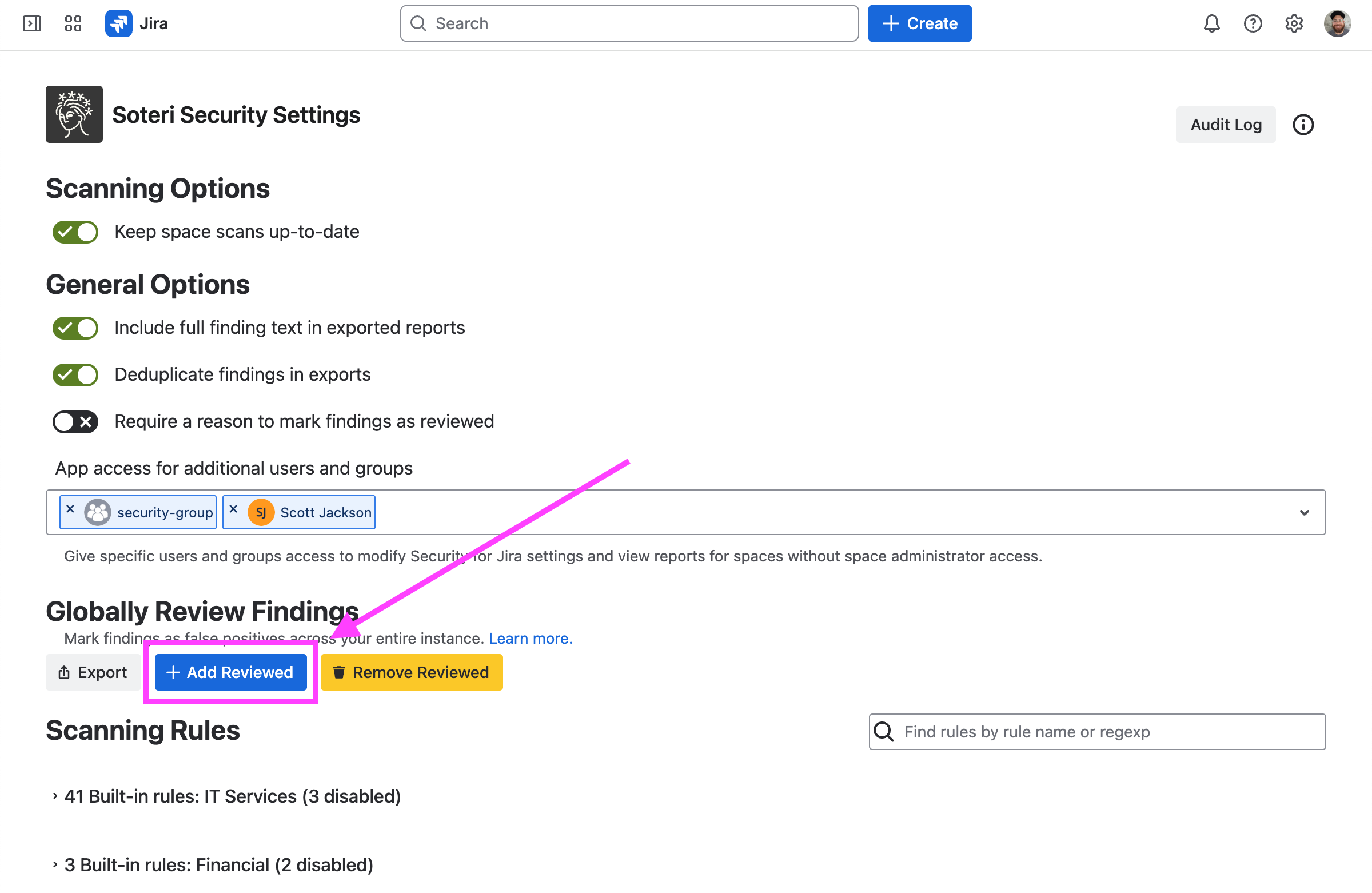 Navigate to the settings page. Then, click on the “Add Reviewed” button under “Globally Review Findings”: