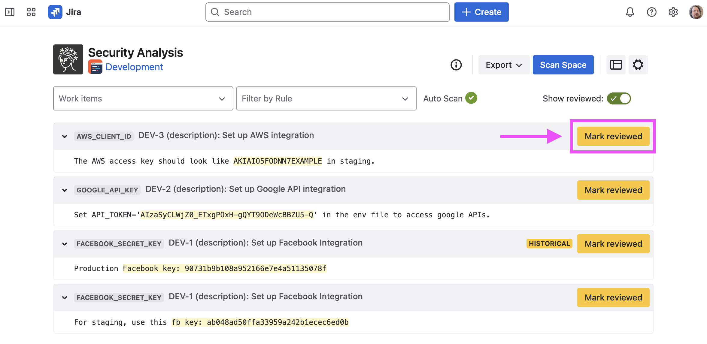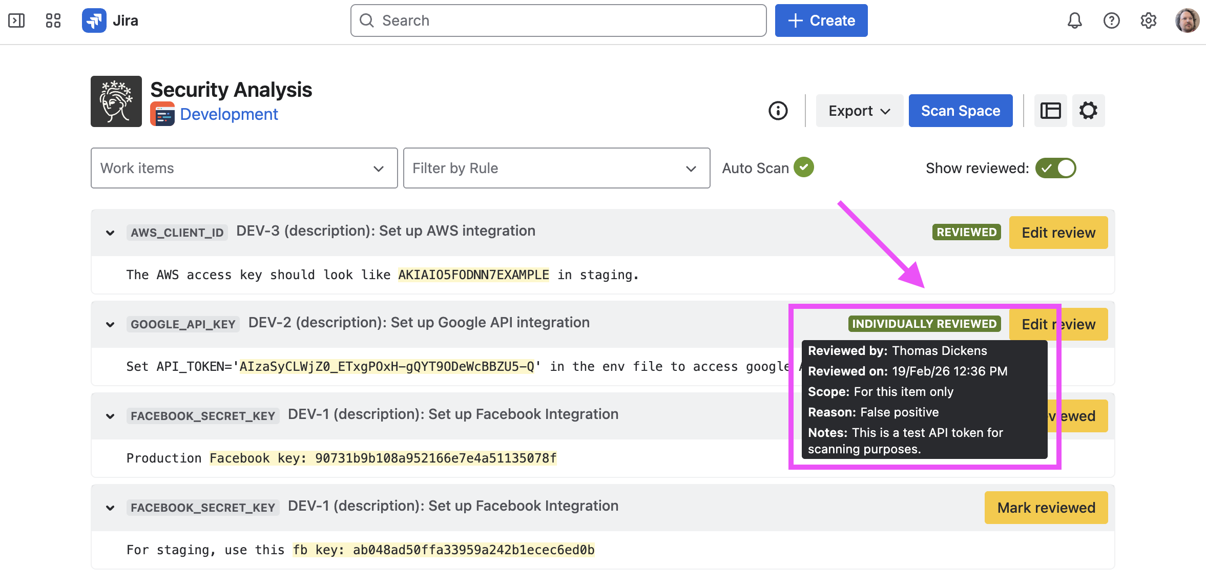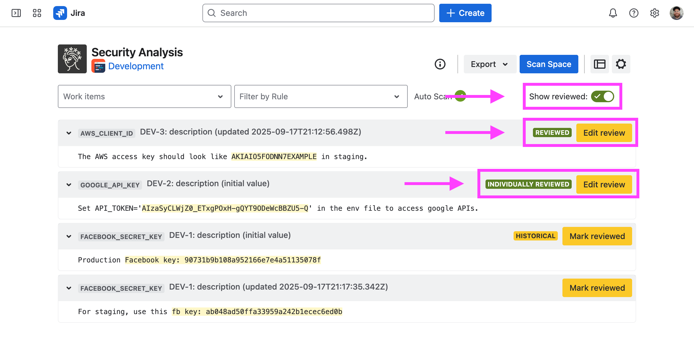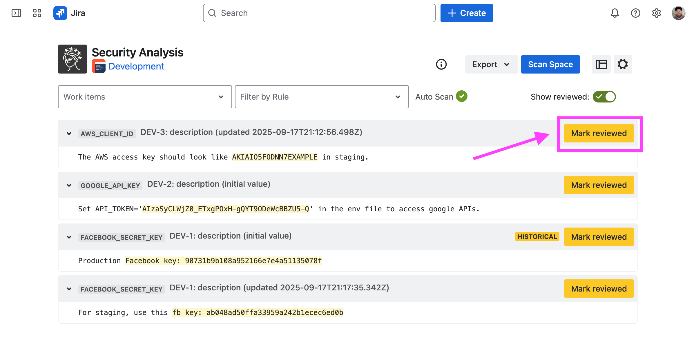 Sometimes, Security for Jira will find false positives, credentials which have already been revoked, etc. If this happens, you can review the finding. This marks the finding—as well as any other findings which exactly match it—as reviewed in current and future scans.
