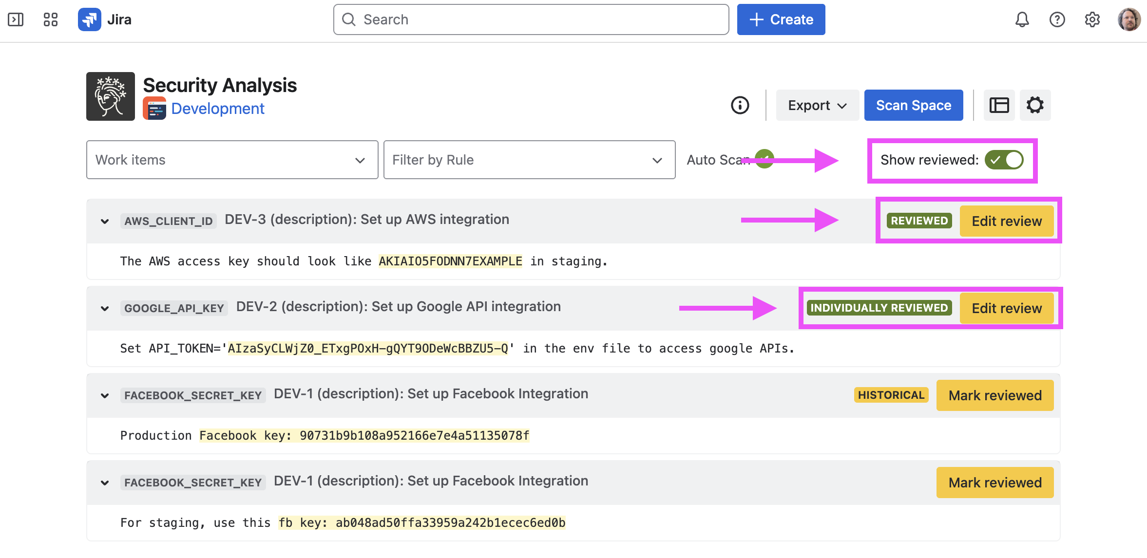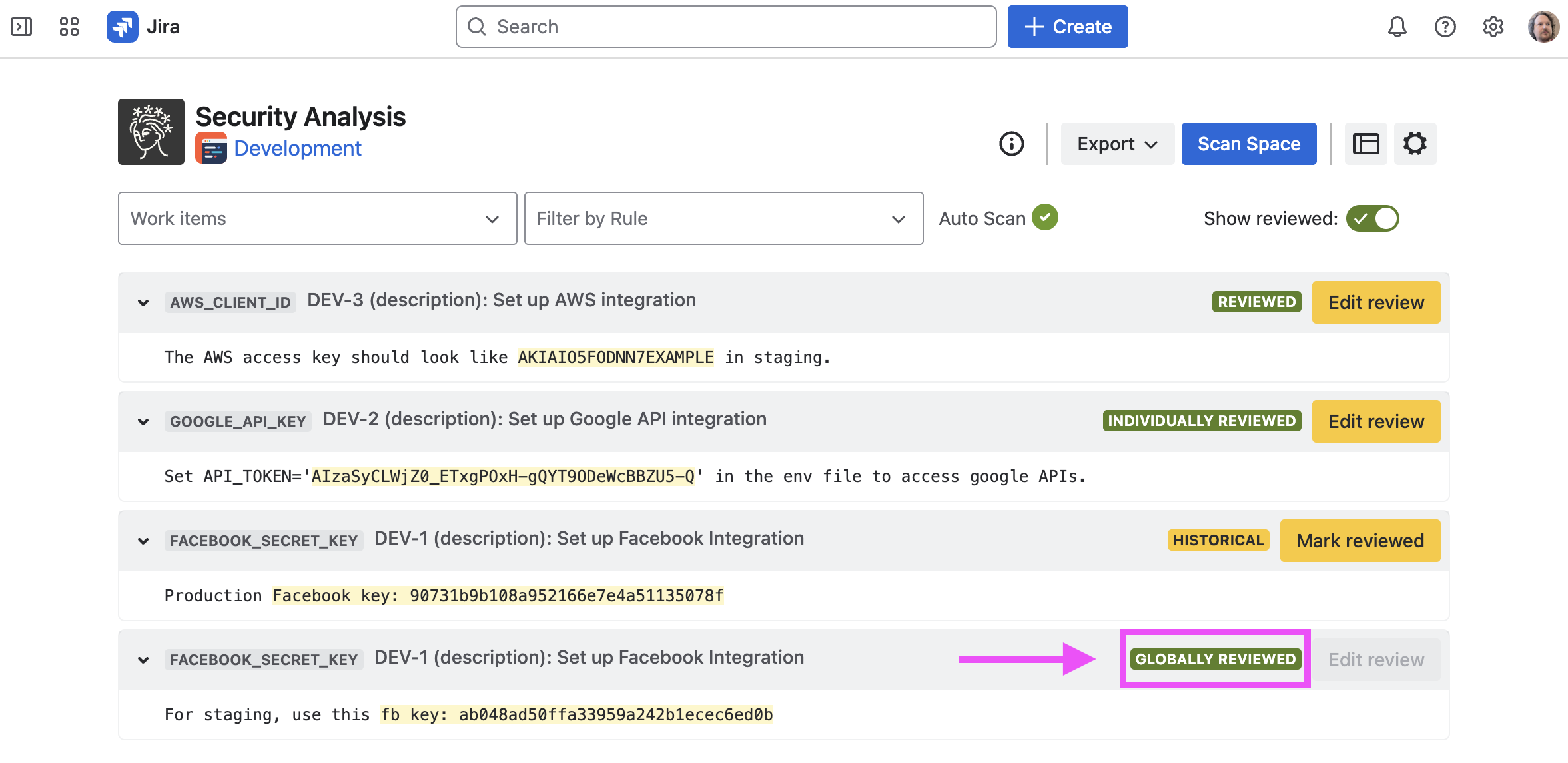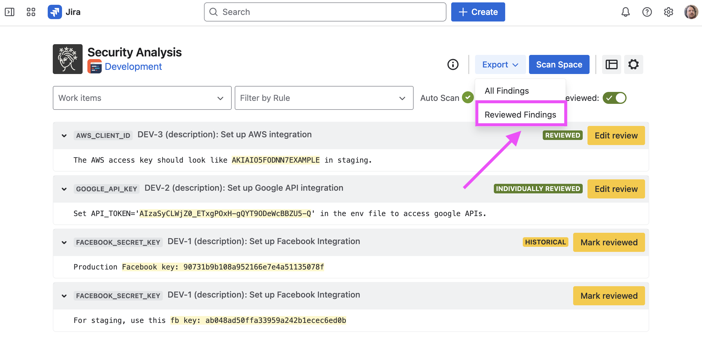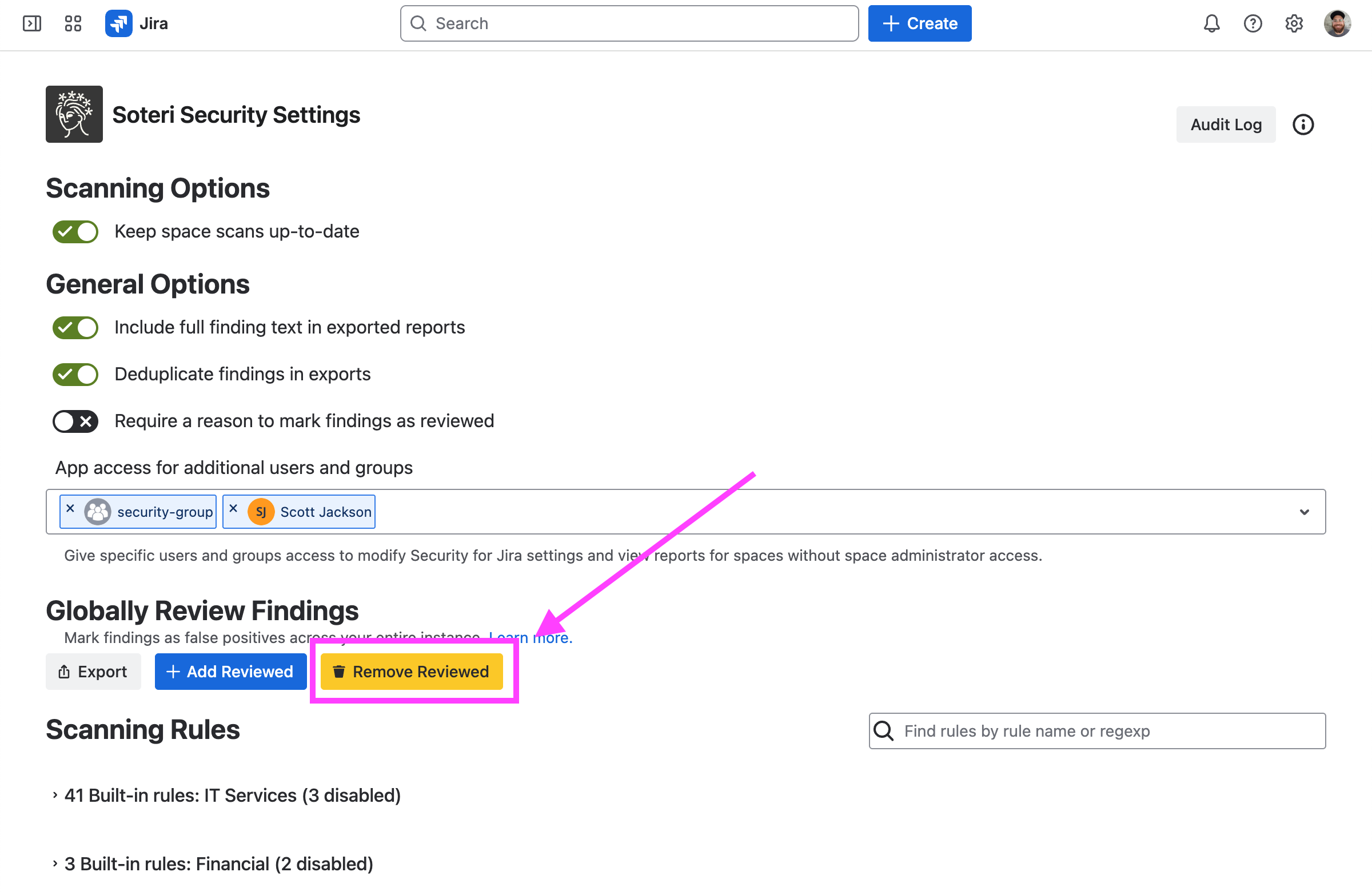 Sometimes, Security for Jira will find false positives, credentials which have already been revoked, etc. If this happens, you can review the finding. This marks the finding—as well as any other findings which exactly match it—as reviewed in current and future scans.