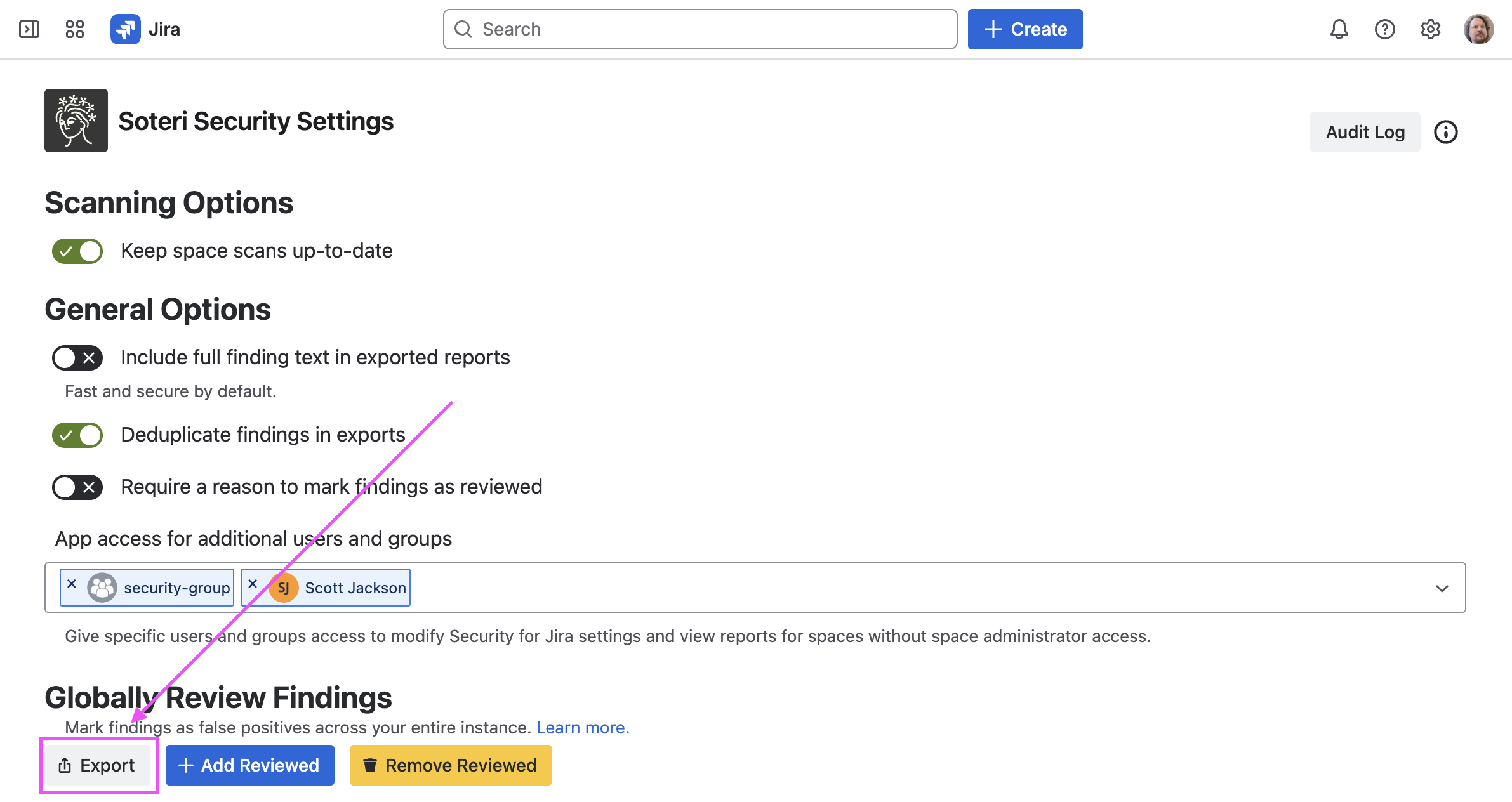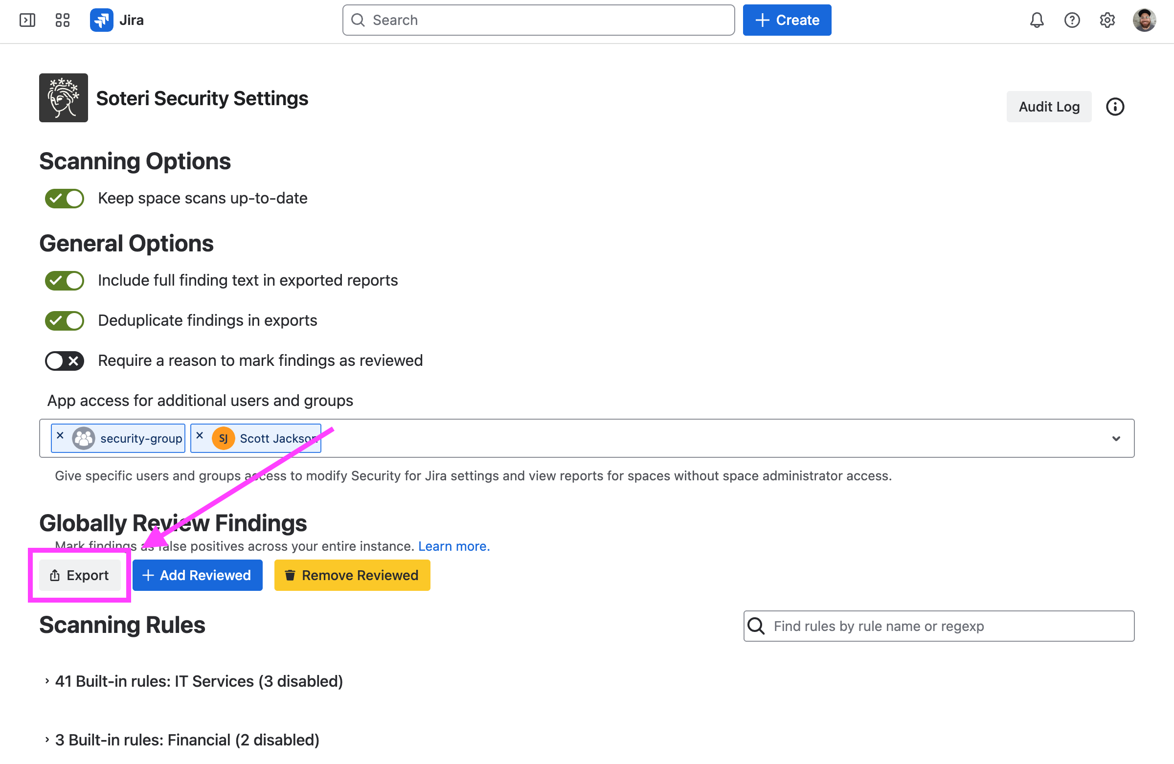 Navigate to the settings page. Then, click on the “Export” button under “Globally Review Findings”: