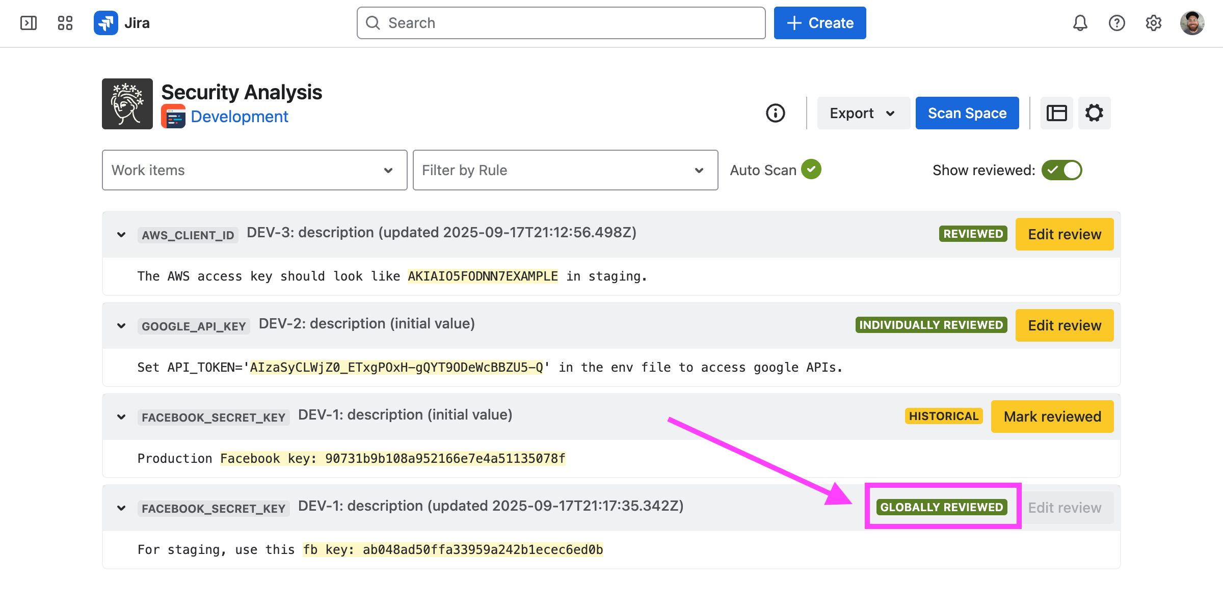 A reviewed finding can be scoped to the space it appears in or to a specific instance. Findings that cannot be reviewed at space level (because they do not capture the entire secret) can be reviewed for that instance only.