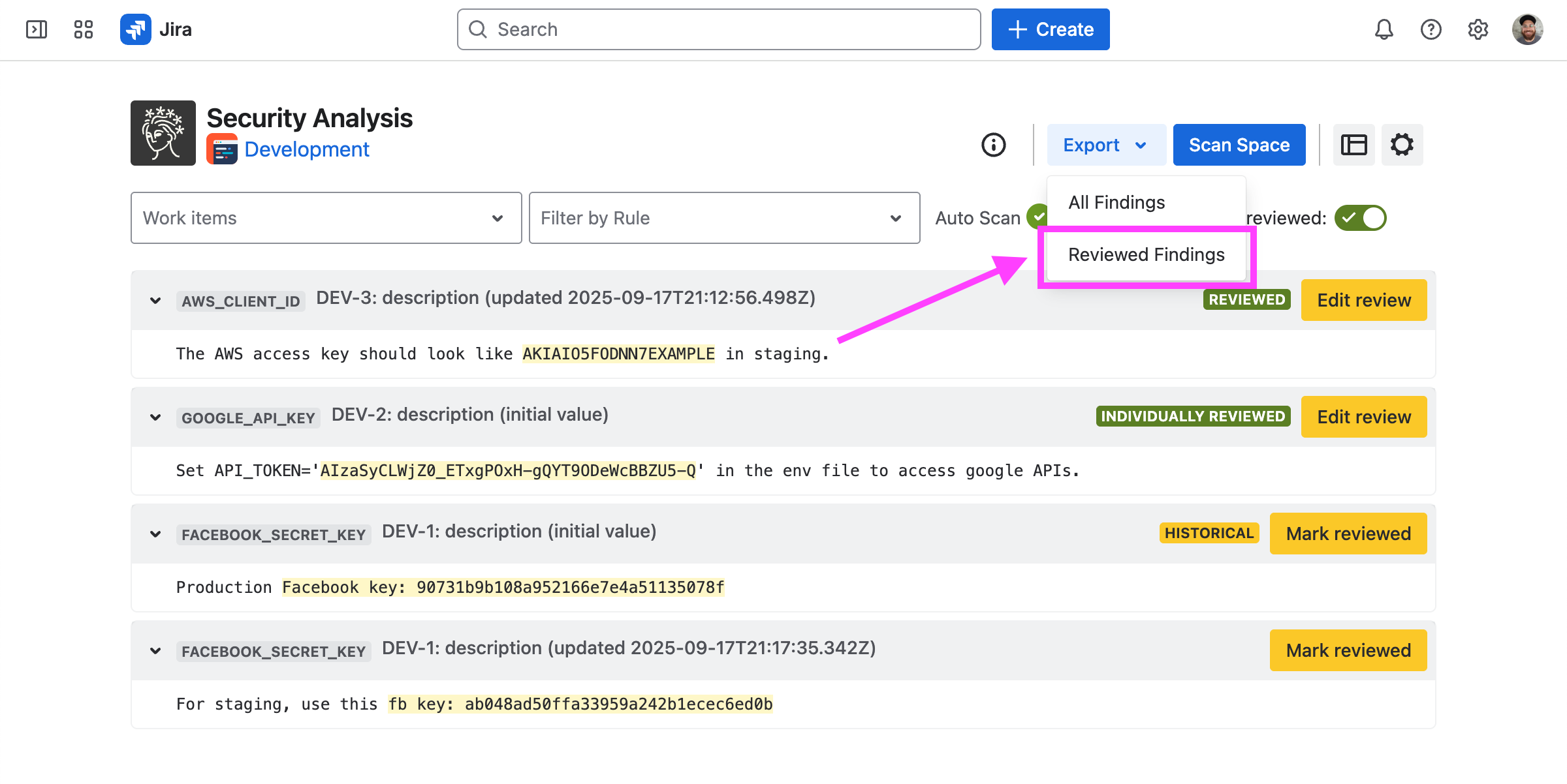 Information about reviewed findings for a space, such as who marked them reviewed and when, can be exported by choosing Reviewed Findings from the Export dropdown on the Security Analysis page.