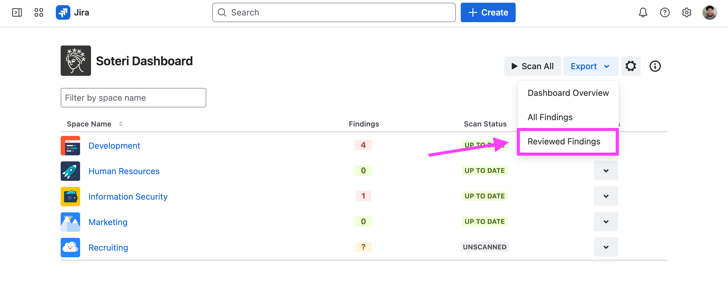 From the dashboard, you can export reviewed findings for all spaces that you administer.