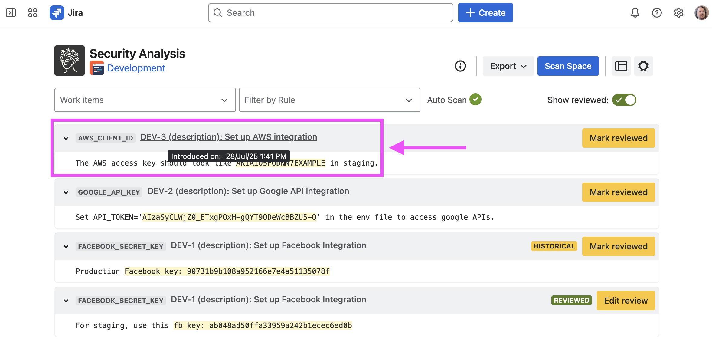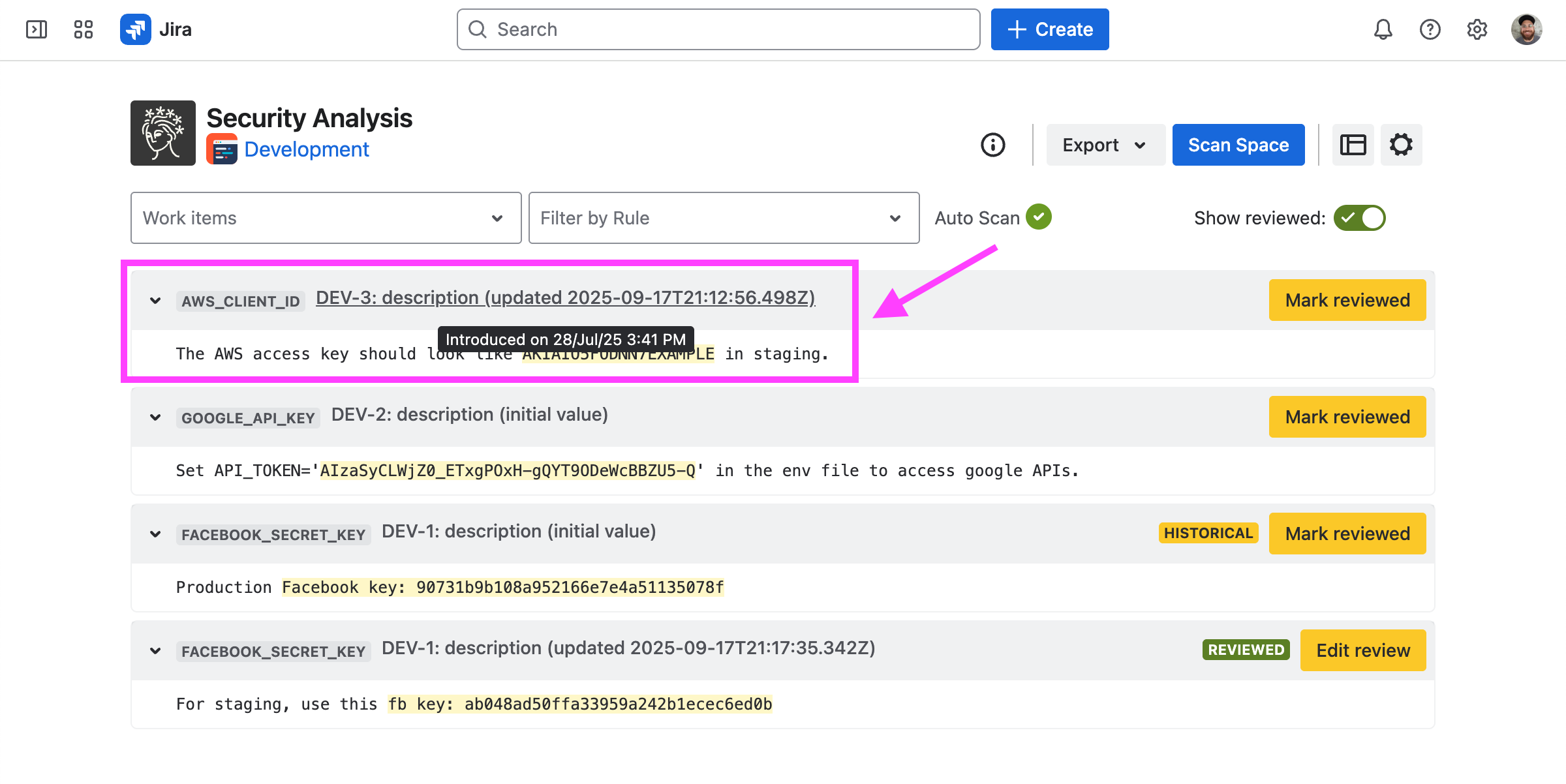 Findings in Jira description fields can sometimes persist over multiple updates to the field. To determine when the finding was first introduced, simply hover over the finding's location or timestamp.