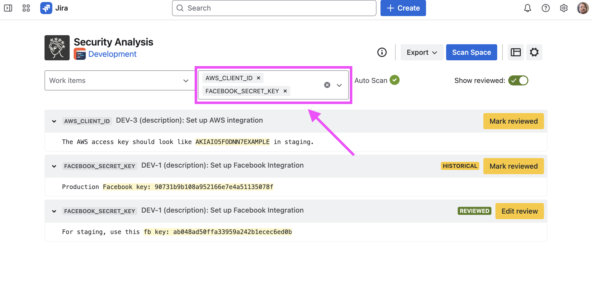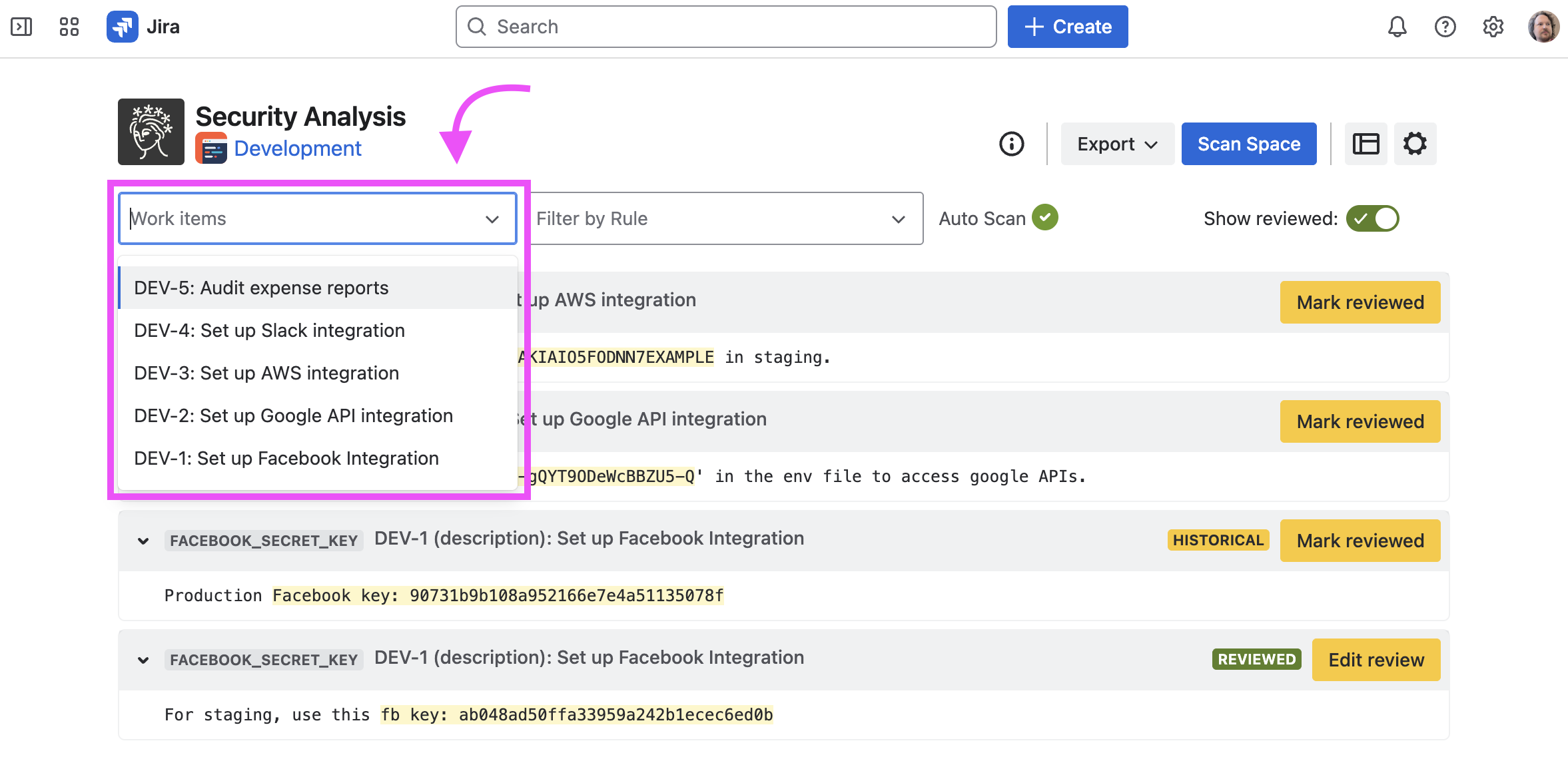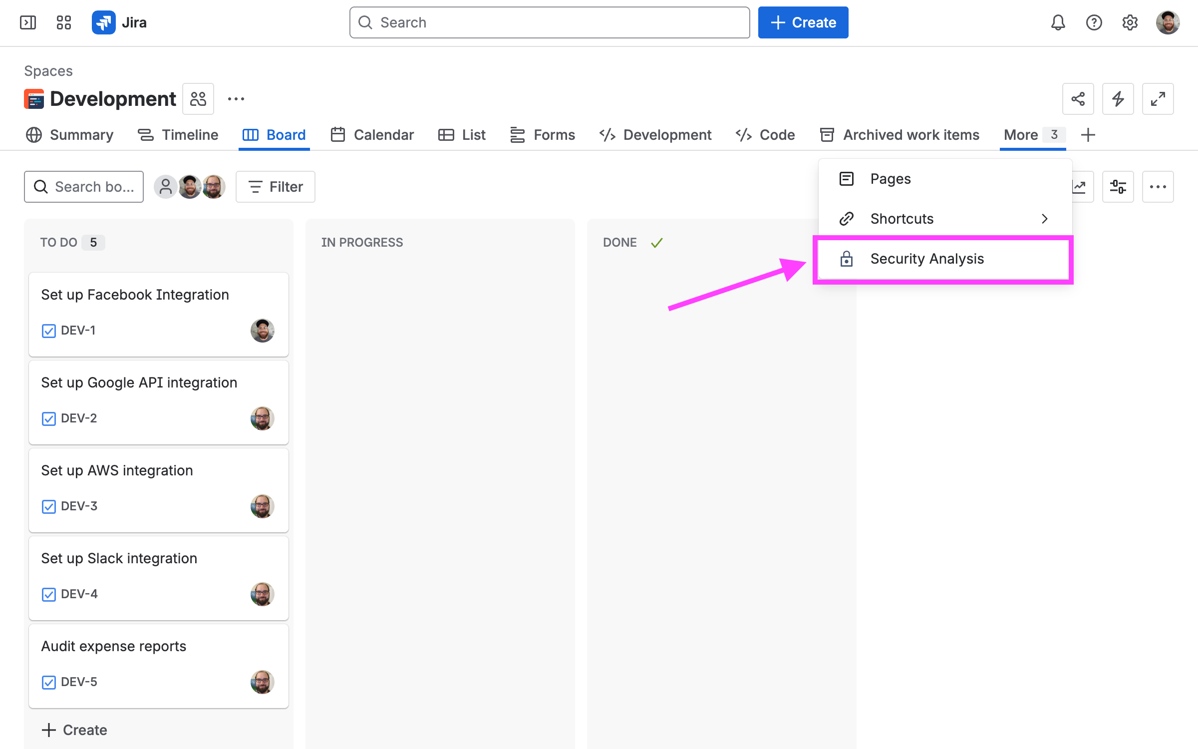 Or, while viewing the space in Jira, you can select “Security Analysis” in the list of tabs: