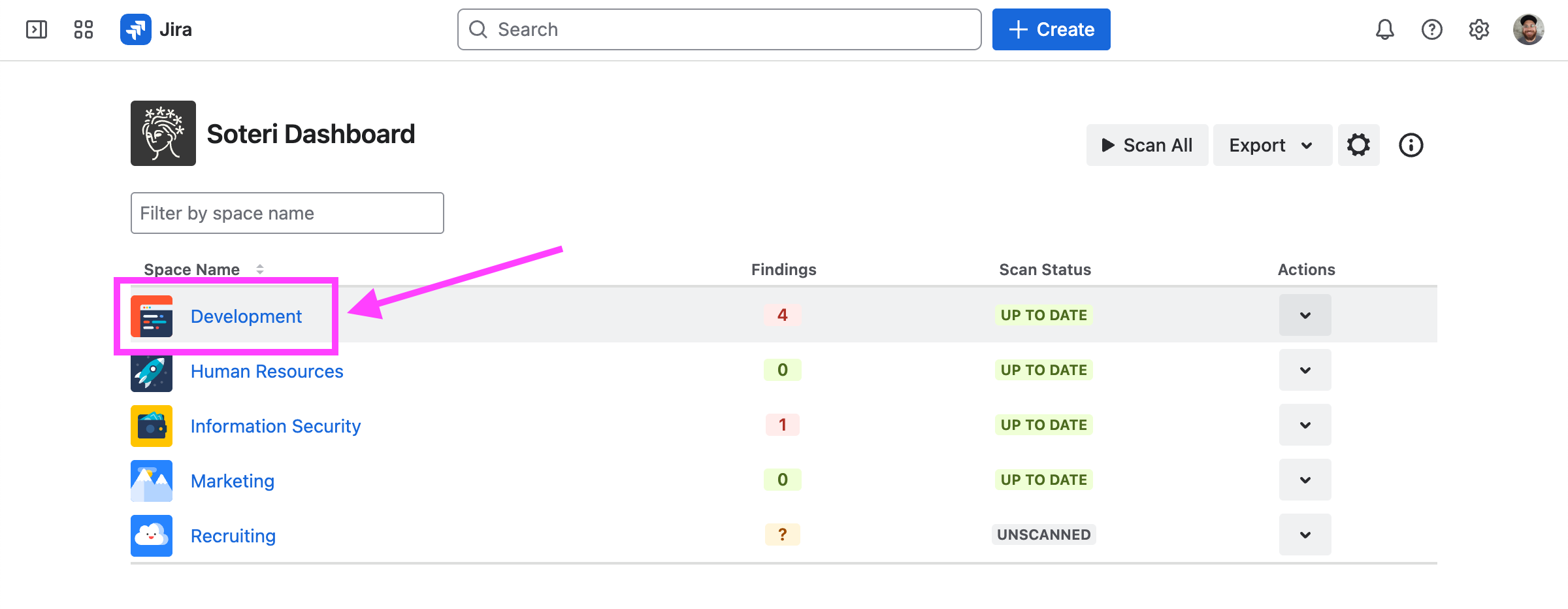 The space’s scan status and all unique scan findings for the space will be displayed.