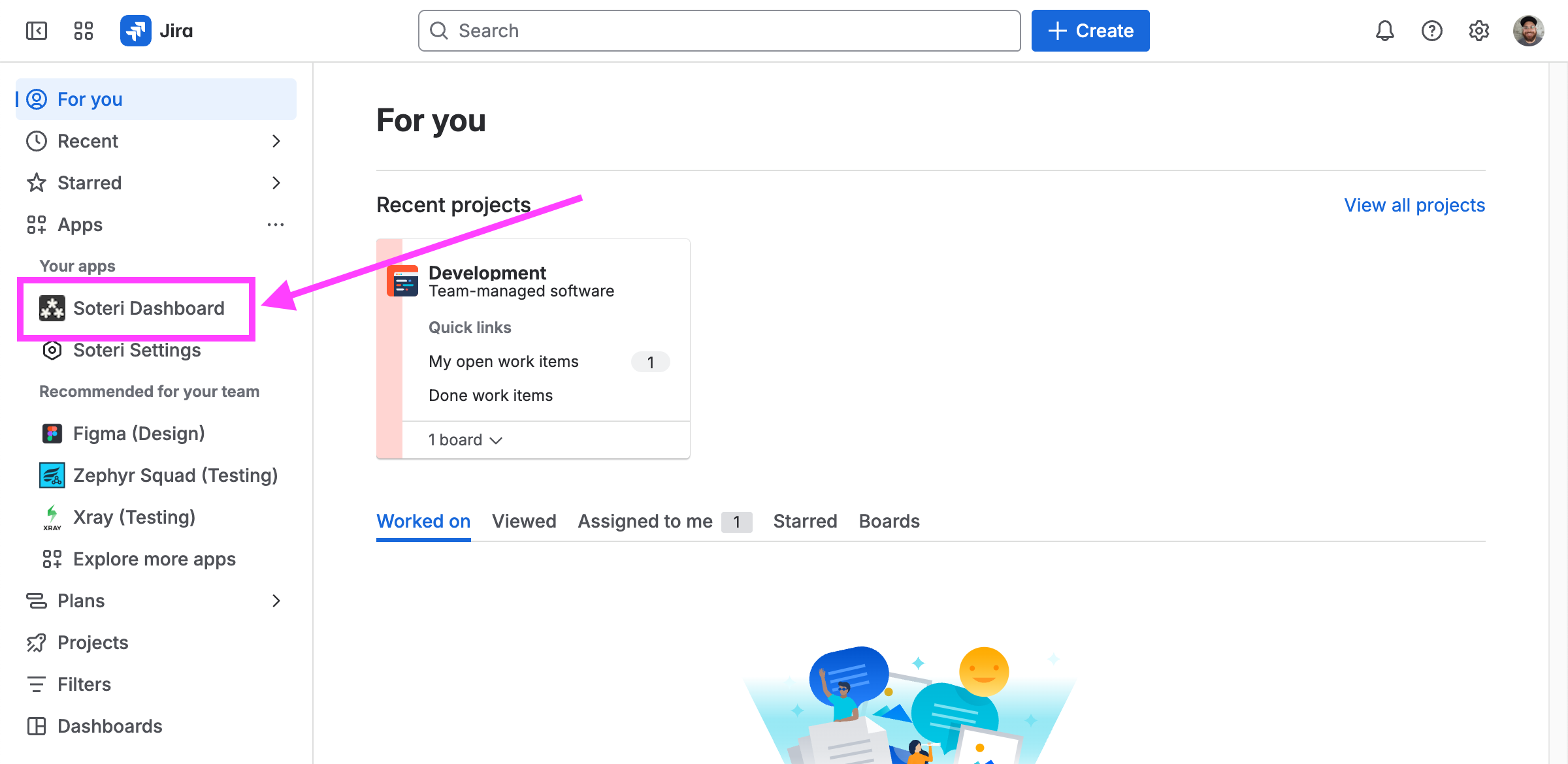 The Soteri Dashboard allows users to view the scan statuses of all Jira projects they can administer. It can be accessed by clicking the link in the Apps menu: