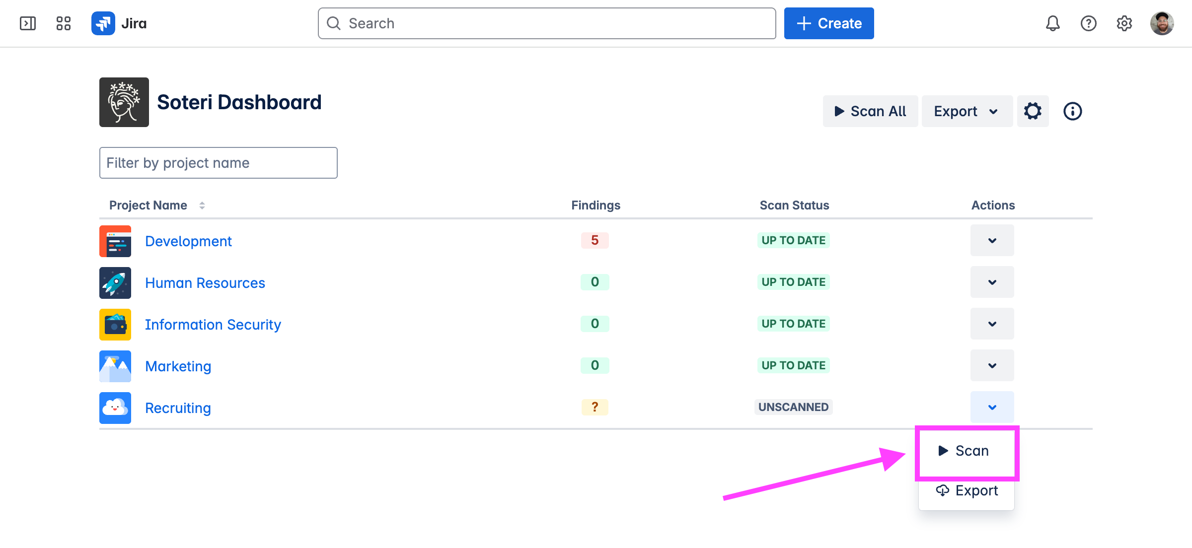 Clicking on a project’s “Actions” dropdown menu reveals the options “Scan” and “Export”: