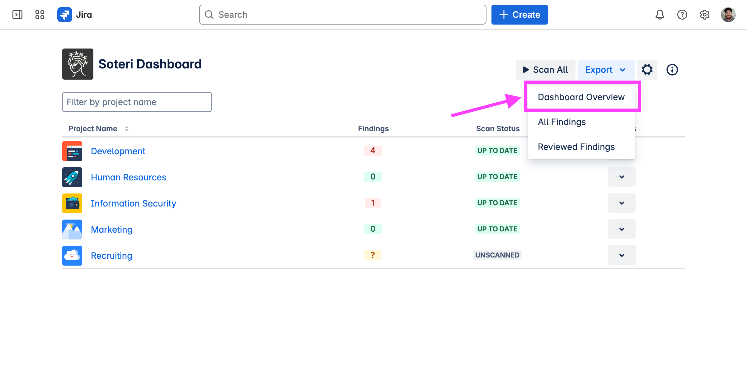Security for Jira Cloud allows users to export the list of projects visible on the dashboard together with their individual scan status, up to date status, and the number of unreviewed findings in the project.