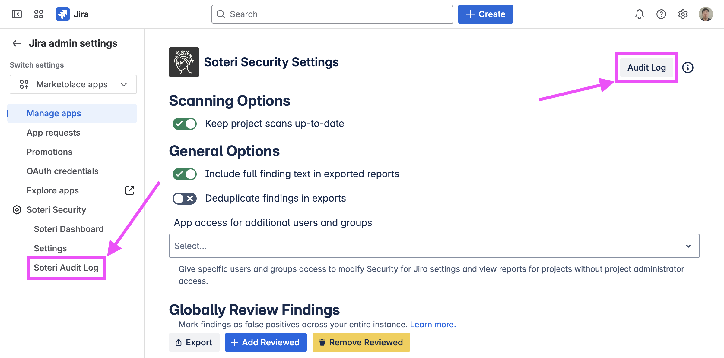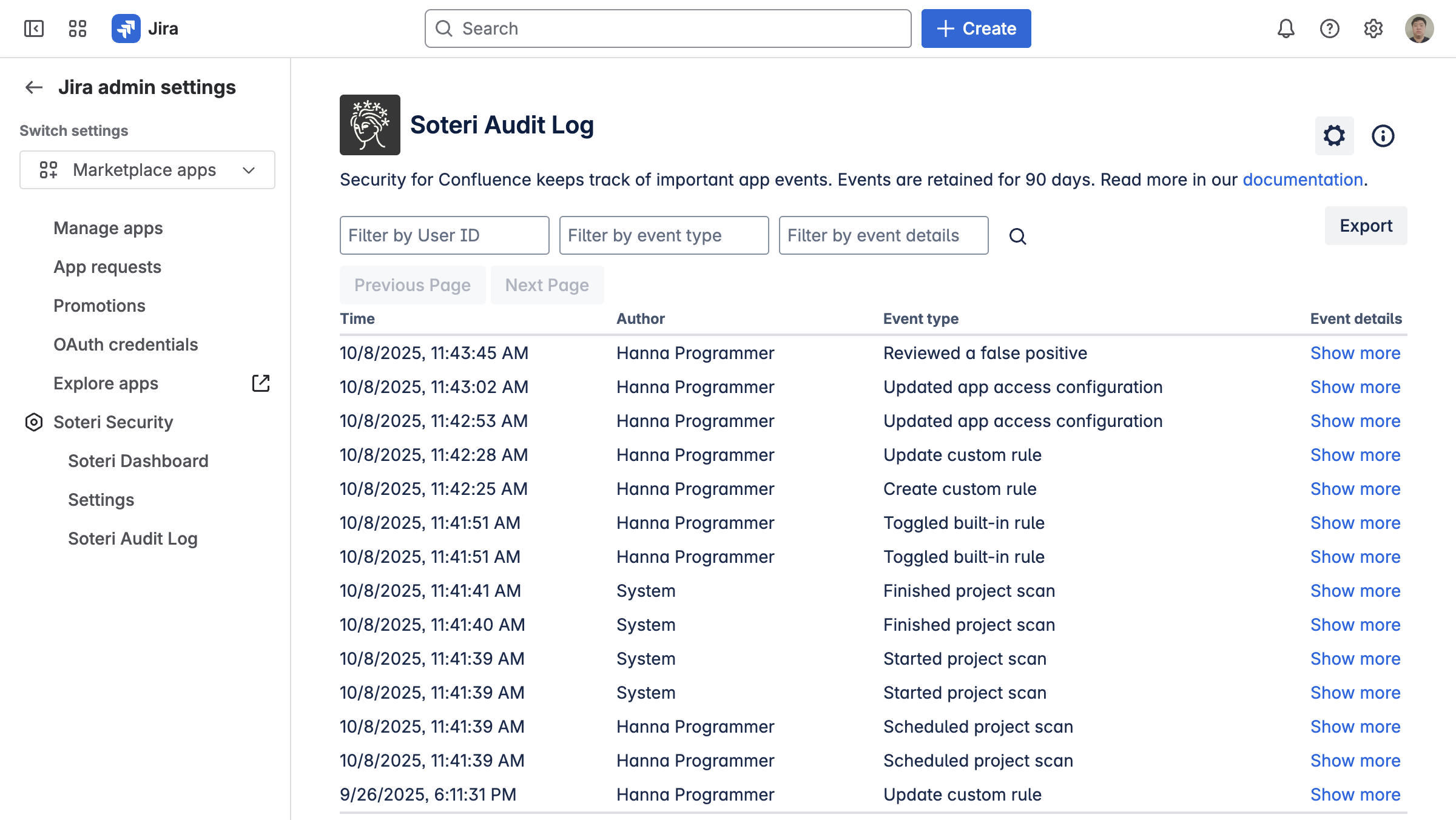 From the Jira administration page, select Soteri Audit Log under Soteri security. It can also be accessed from the top right of the settings page.