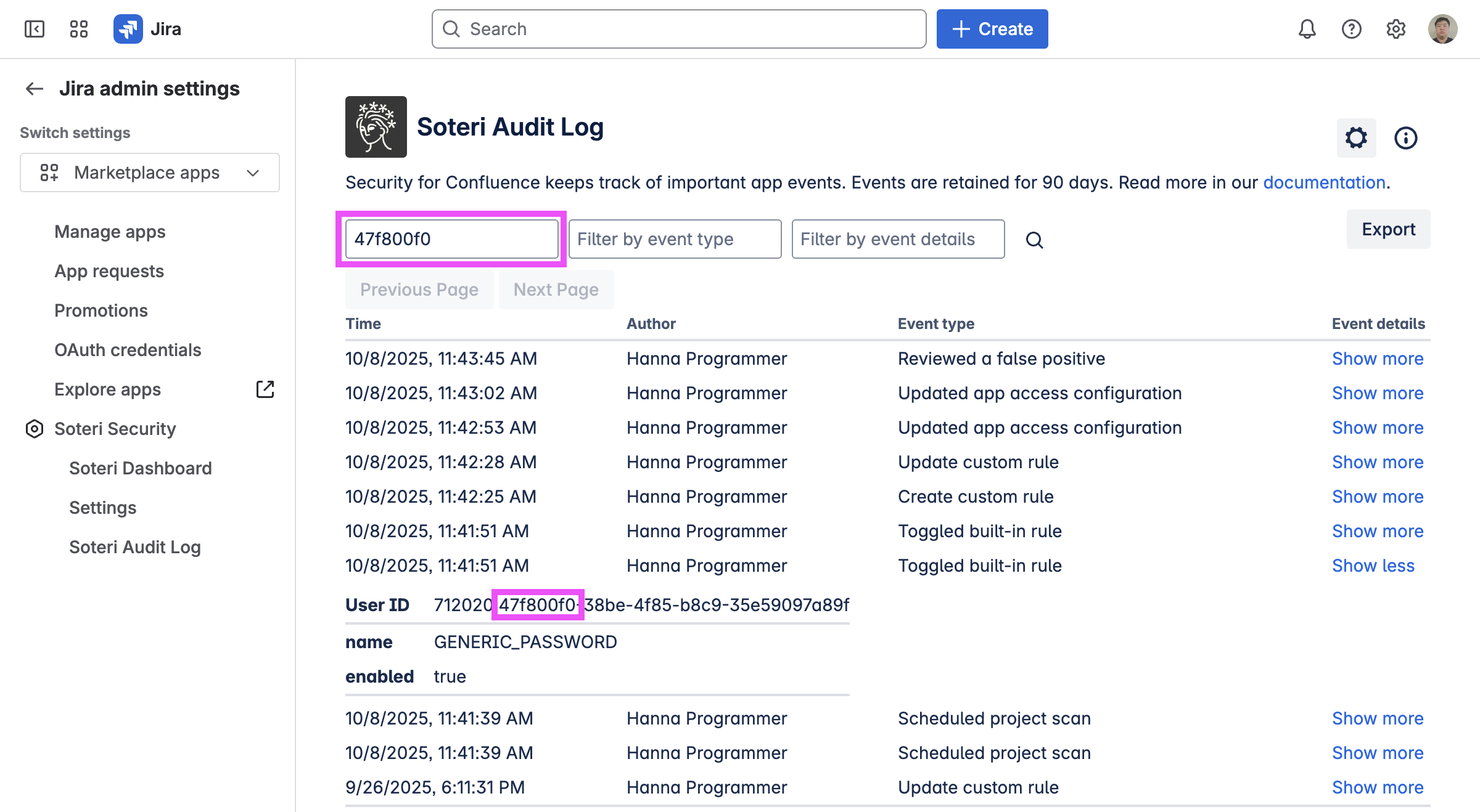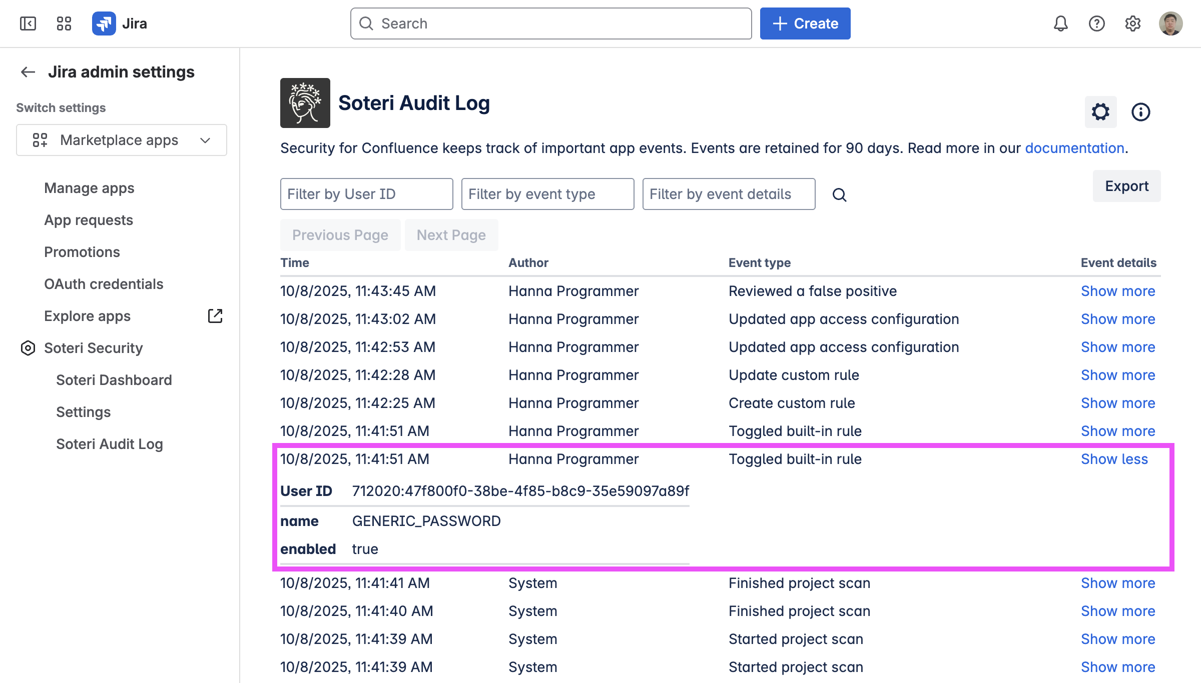 The “Show more” column on the right can be clicked to show the details of individual events, including the Atlassian user ID of the author. (Events with no associated user, such as scans starting and completing, use “System” as the author)